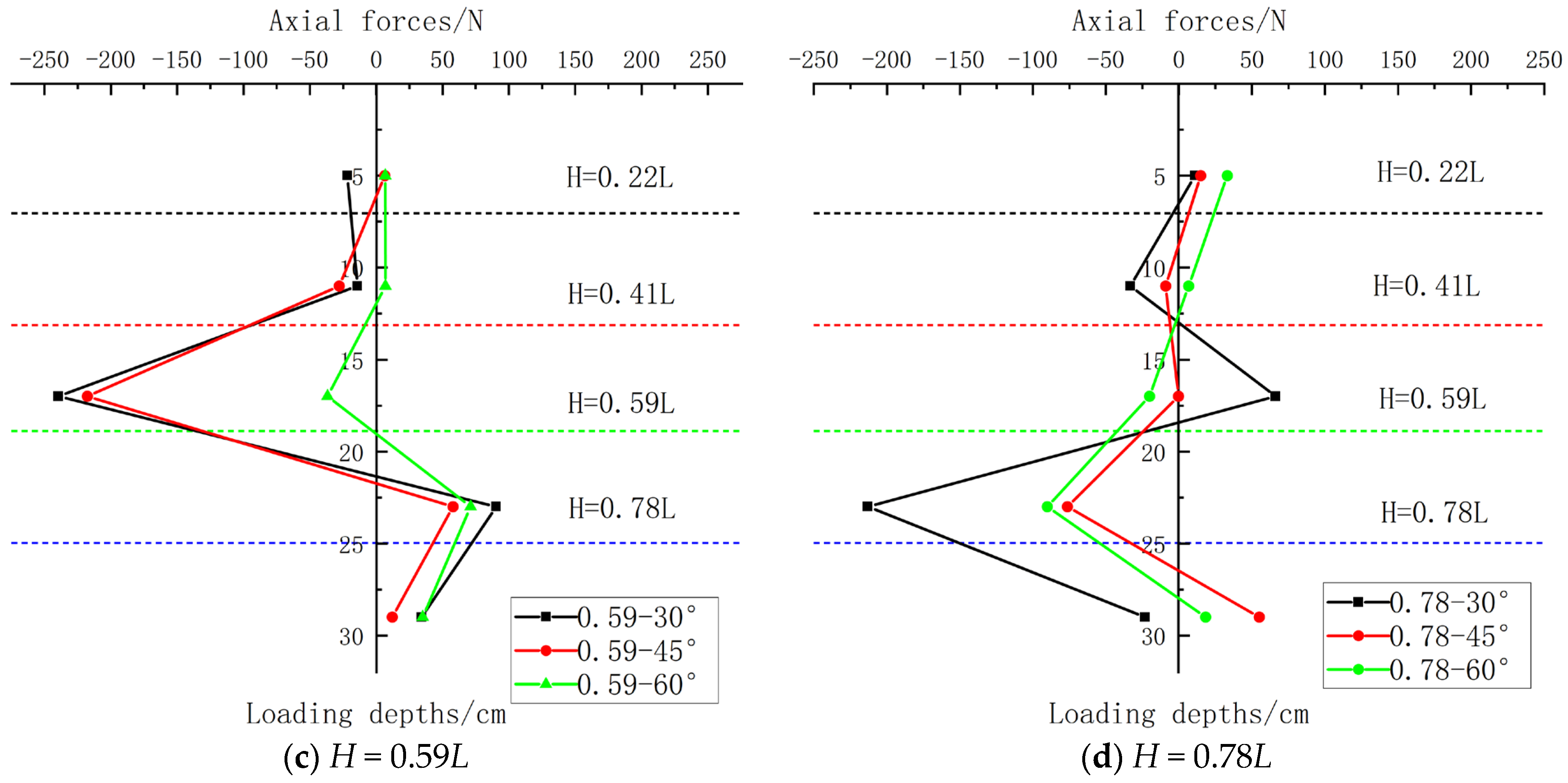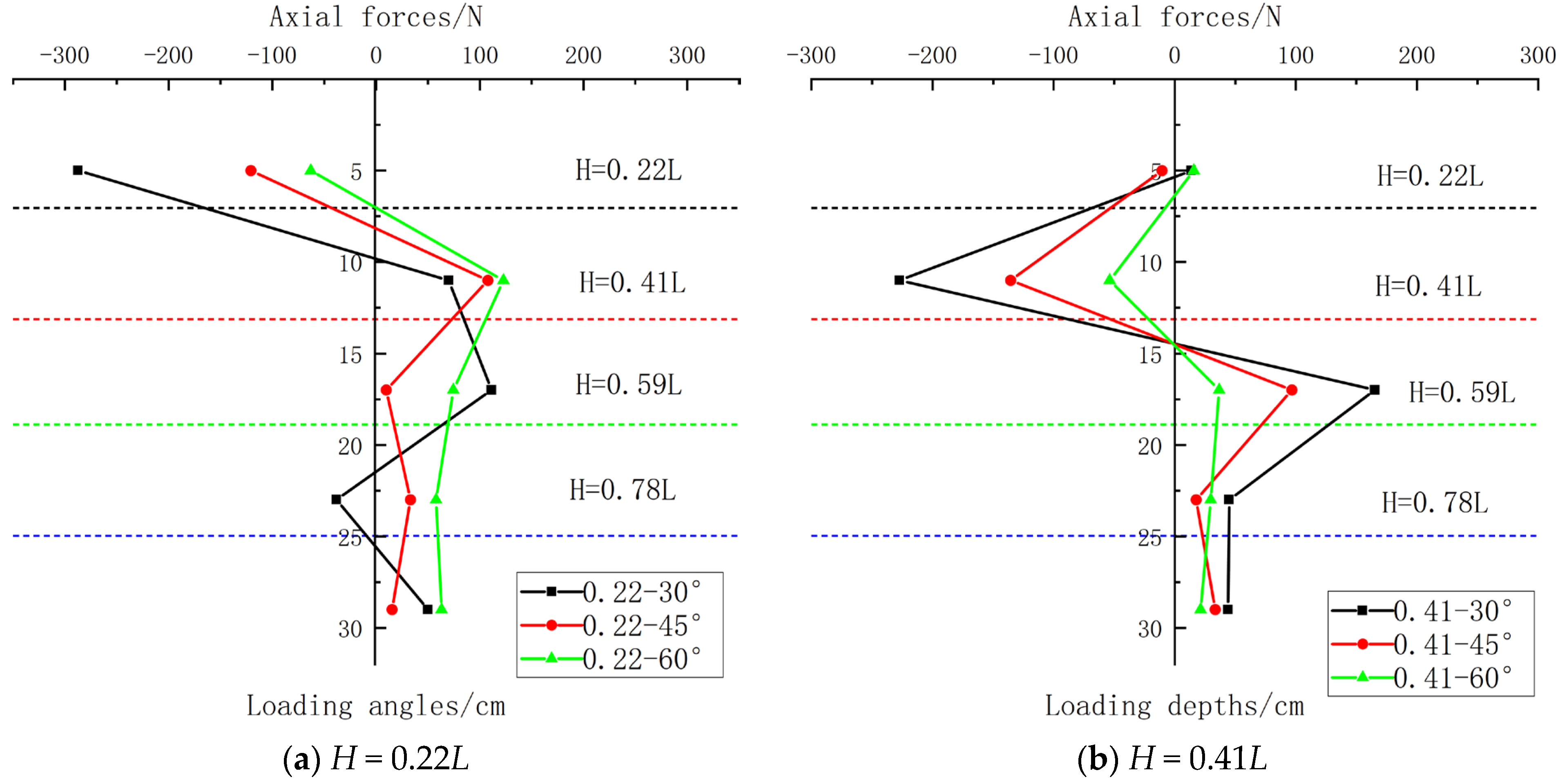 (3) For loading at the same angle but different depths, the axial force distribution along the pile depth follows a consistent pattern: an abrupt change occurs near the loading point, with the upper segment under compression and the lower segment under tension. The non-zero initial axial force observed at H = 0.22L is likely due to the loading point’s upper location, limited strain gauge coverage, and insufficient data acquisition in shallow zones.