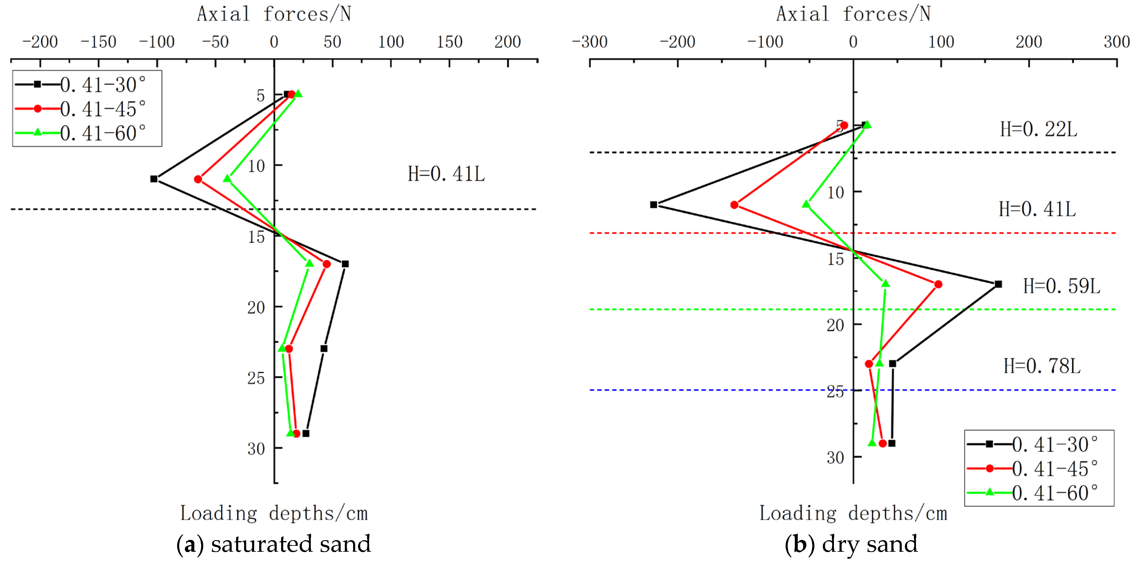 Figure 17, it can be observed that the axial force distribution patterns under different soil conditions are fundamentally consistent. As burial depth increases, the axial force initially rises to a maximum negative value, gradually approaches zero near the loading point, then increases to a maximum positive value before gradually decreasing. The pile axial force progressively diminishes as the loading angle increases. The axial force in saturated sand is approximately half of that observed in dry sand.