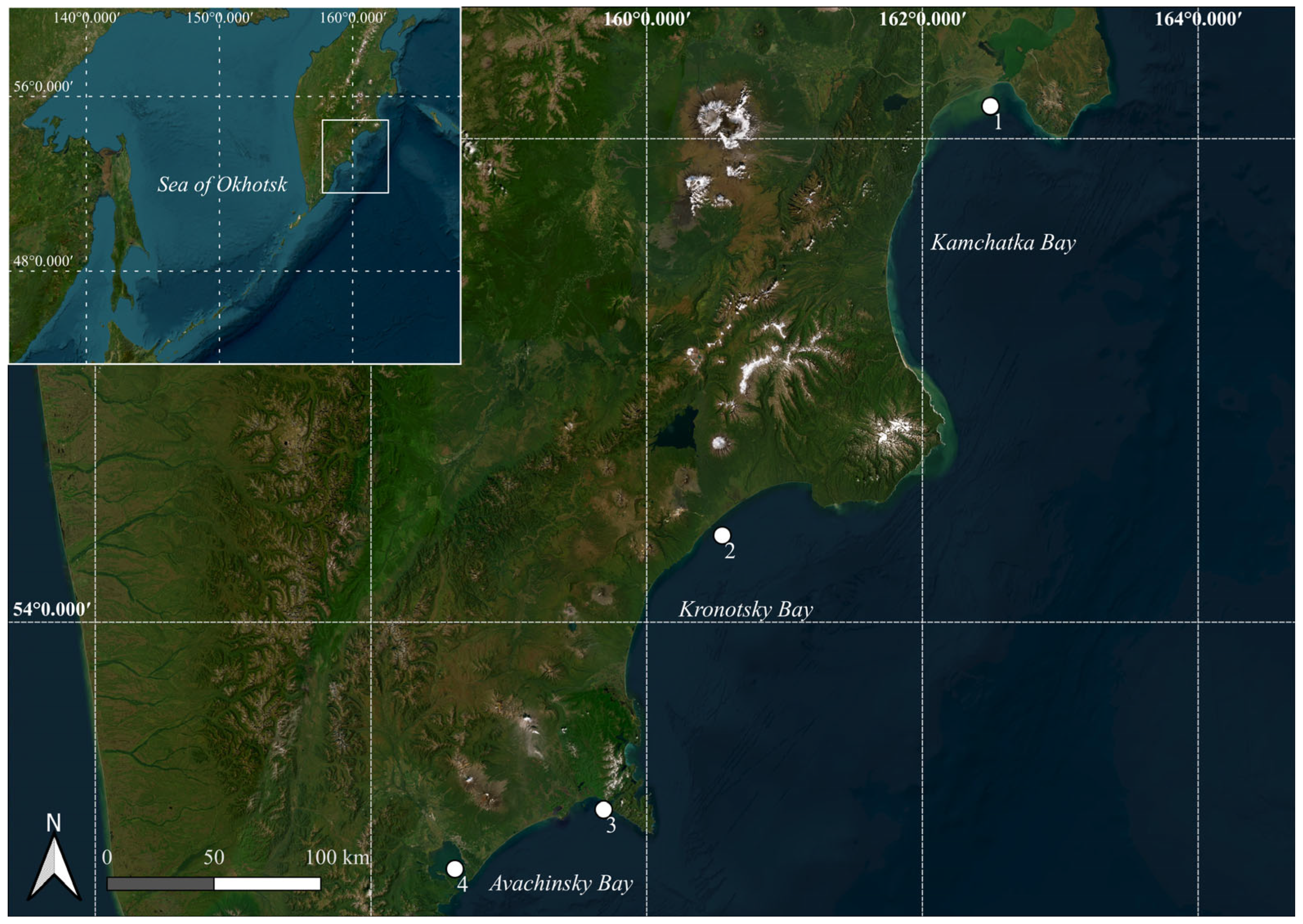 - Semkin, P.; Pavlova, G.; Lobanov, V.; Barabanshchikov, Y.; Kukla, S.; Sagalaev, S.; Shvetsova, M.; Shkirnikova, E.; Tishchenko, P.; Tibenko, E.; et al. Nutrient Flux under the Influence of Melt Water Runoff from Volcanic Territories and Ecosystem Response of Vilyuchinskaya and Avachinskaya Bays in Southeastern Kamchatka. J. Mar. Sci. Eng. 2023, 11, 1299. [Google Scholar] [CrossRef]