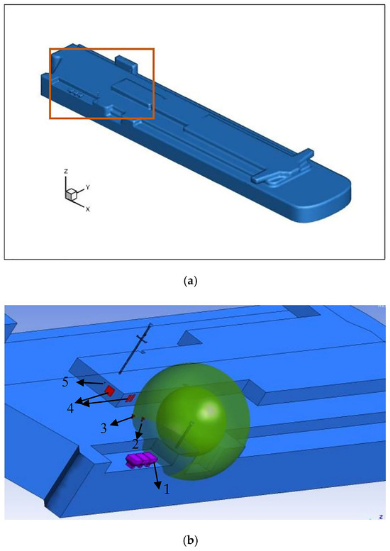 Schematic diagram of a 3D model of the LNG-powered vessel. (a) Complete model of the entire ship. (b) Details of the sensitive area near the vent mast are in the box of (a). (1—Fan room; 2—Exhaust vent of the ladder way; 3—Air intake of the ladder way; 4—Emergency power generator room ventilation louver; 5—Exhaust pipe of the Emergency power generator room).