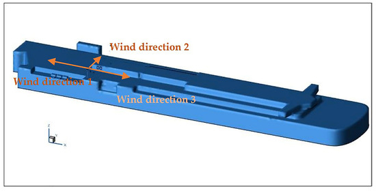 - Wind direction. As depicted in Figure 2, various wind directions are considered to evaluate the influence of gas release from the vent mast on the surrounding sensitive areas. Specifically, we considered the wind blowing towards the stern direction (wind direction 1), port-side direction (wind direction 2), and bow direction (wind direction 3), respectively.