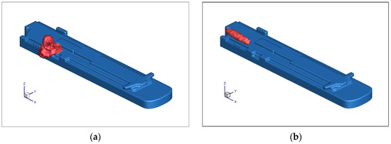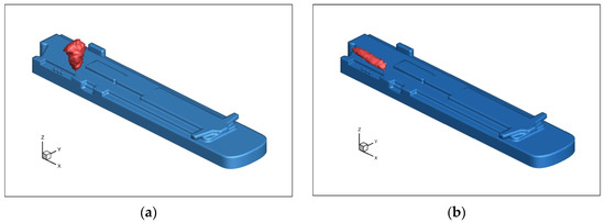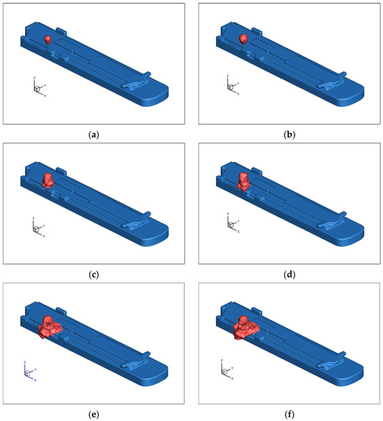 As depicted in Figure 4, when the height of the vent mast reaches 15 m (B/3), the flammable gas cloud does not spread to the deck, ensuring that the deck area remains within the safety range. Nevertheless, with a height of 6 m in Figure 3, the flammable gas cloud accumulates on the deck surface. At this height, the working area for the crew and the sensitive areas around the fan and air outlets are within the gas explosion range, presenting substantial risks. Therefore, the vent mast height has a significant impact on the gas dispersion behavior. A greater height of the vent mast leads to a more favorable upward diffusion trend of the natural gas and a lower risk of gas sedimentation on the deck. When the height is inadequate, there exists a tendency for the flammable gas to deposit on the deck, posing a substantial risk. When the height of the vent mast is relatively high, the flammable gas has not deposited in the vicinity of the deck and remains unaffected by the layout on the deck until the gas release concludes. After the gas release from the vent mast ceases, the gas mass undergoes heating in the atmosphere, causing it to exhibit an upward movement tendency.