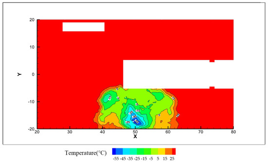 Since the released natural gas is cryogenic, during the release process from the vent mast, it exchanges heat with the environment, resulting in a sharp decline in the temperature of the surrounding environment. Consequently, the gas release has the potential to cause frostbite to the surrounding personnel, steel plate, and equipment [32]. When the gas temperature drops below −25 °C, the probability of personnel frostbite and hull damage is relatively high, and this area is identified as a cryogenic hazard area. As shown in Figure 7, the deck temperature radiates outward from the low-temperature center at the vent mast position, and there exists a certain range of cryogenic hazard area on the deck. The temperature in the cryogenic hazard zone adjacent to the vent mast is below −55 °C, which poses a significant risk of cryogenic injuries to the hull and personnel. The deck material is AH36 steel, which is suitable for temperature scenarios above −20 °C. The cryogenic hazard zone formed on the deck due to gas release will cause the steel structure on the deck to become brittle, which increases the risk of structural damage. In conclusion, when the height of the vent mast on the LNG-powered vessel is not high enough, significant safety risks exist during the gas release process, including gas combustion, gas explosion, and cryogenic injuries.