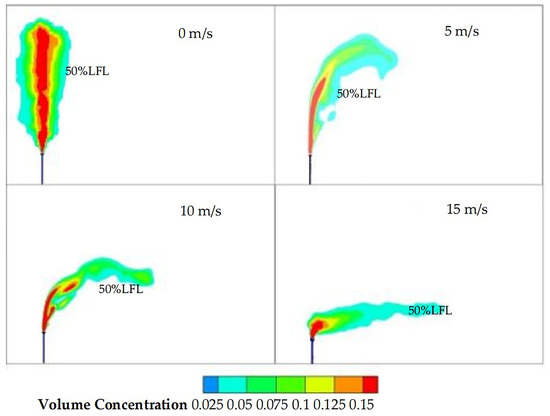 This section further explores the influence of wind velocity on the gas release from the vent mast in detail, and analyzes the dispersion simulation results of gas release under various wind speed conditions of 0 m/s, 5 m/s, 10 m/s, and 15 m/s. The concentration distribution of the flammable gas from the vent mast at different wind speeds is presented in Figure 10. As displayed in Figure 10, the natural gas concentration diminishes from the top of the vent mast towards the periphery while the flammable gas cloud diffuses in the direction of the wind. As the wind speed increases, the concentration distribution extends along the wind direction, and the gas diffusion distance increases in the wind direction. It can be observed from Figure 10 that the height attainable by the combustible gas cloud diminishes, and currently, the size of the flammable gas cloud also reduces with the increase in wind speed.