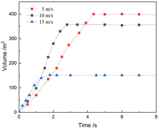 As elaborated in Section 2.1, regions where the gas concentration reaches 2.5% are classified as hazardous areas on LNG-powered vessels. A statistical analysis was carried out on the volume of this hazardous area, that is, the volume of the flammable gas cloud within the 2.5% equal concentration plane. Based on the statistical calculations, the variation in the gas cloud volume with a gas concentration exceeding 2.5% in relation to the gas release time under different wind speed conditions is shown in Figure 11 and Figure 12.