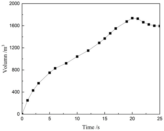 The windless condition is depicted in Figure 12, where the variation tendency of the volume of the flammable gas cloud with respect to the gas release time from the vent mast exhibits a certain degree of difference compared with that under other conditions in Figure 11. From the initiation to the termination of gas release, the volume of the flammable gas cloud continuously increases at a relatively rapid rate. After the gas release stops at the 15th second, the flammable gas cloud further expands, and its volume further augments, reaching the maximum at 20 s, which is in consonance with the simulation results presented in Section 4.1.2. Subsequently, as the gas diffuses in the atmosphere, the volume of the flammable gas cloud diminishes. At a wind speed of 0 m/s, the maximum volume of the flammable cloud is approximately tenfold larger than that at a wind speed of 15 m/s. Higher wind speeds lead to a shorter duration required for the formation of a stable gas cloud.