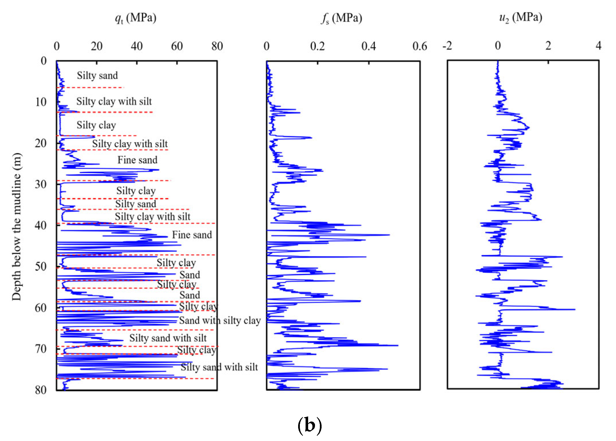 Layer 1-1: This layer consists of silt mixed with mud, and it is grey, saturated and predominantly loose, with some areas slightly dense. The main minerals are quartz and feldspar, with poor gradation. This layer includes shell debris and contains a large amount of fine-grained soil, partially in the form of silt mixed with sand, which is indicative of marine sedimentation. In the CPTU, the tip resistance qc ranges from 0.93 to 3.00 MPa, with an average of 1.71 MPa, while the friction resistance fs ranges from 8.2 to 24.6 kPa, with an average of 13.0 kPa. The thickness of this layer is between 4.9 and 13.5 m.
