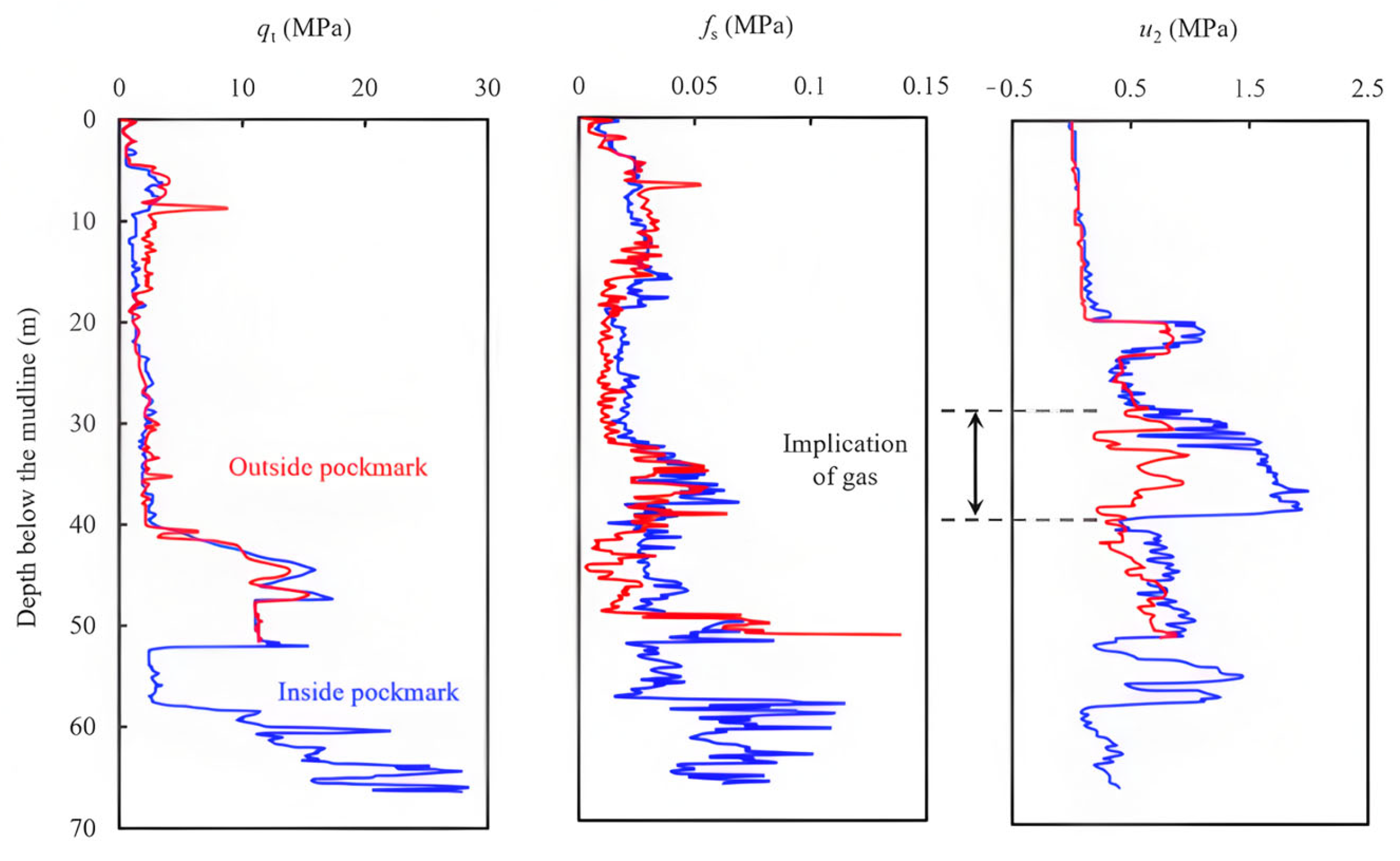 Table 3), CPTU tests were performed inside and outside of a pockmark on the seabed after two months after the release of shallow gas (