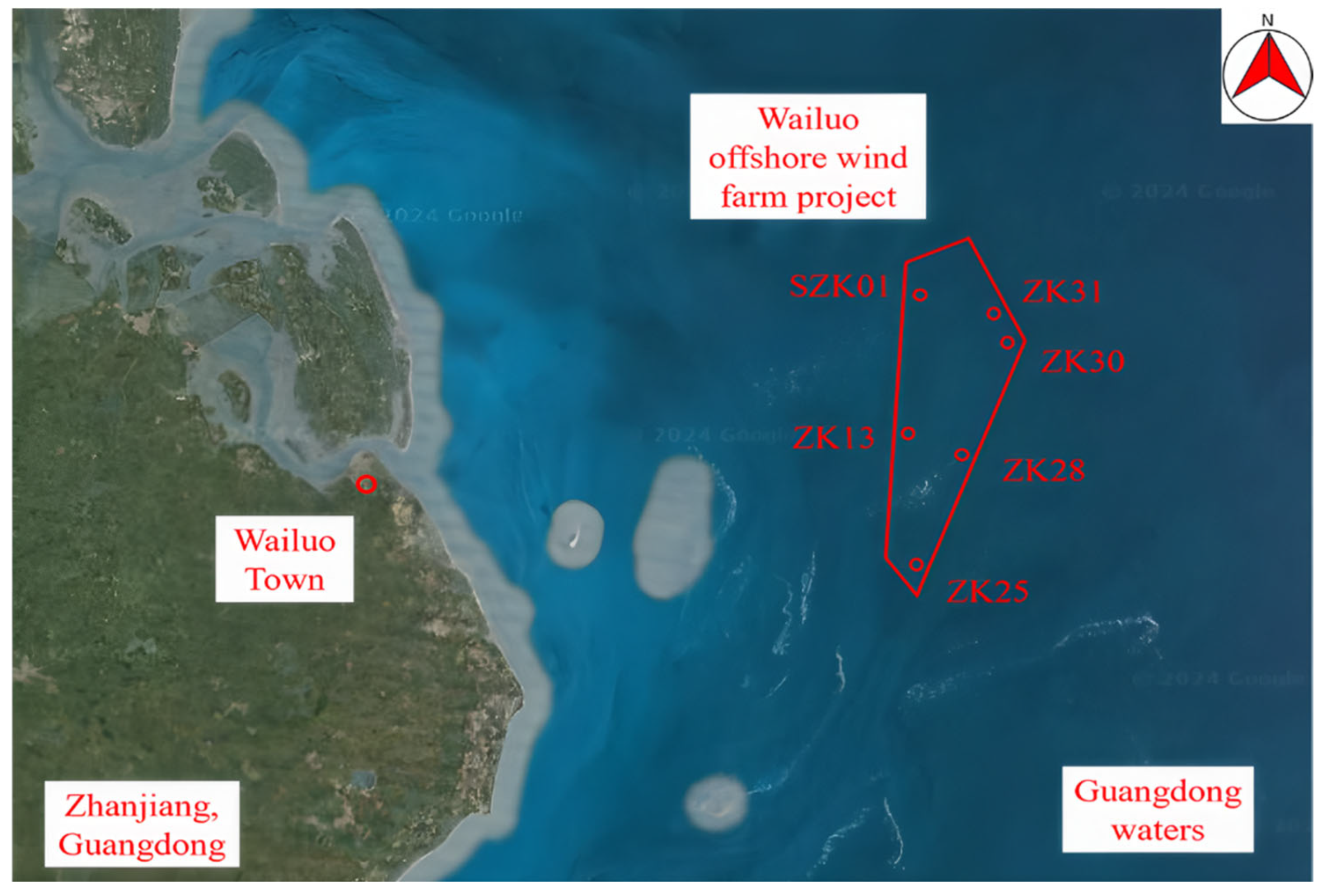 Figure 4a). The site is located approximately 26 km offshore, with a water depth ranging from 32 to 37 m and covers an area of about 64 km