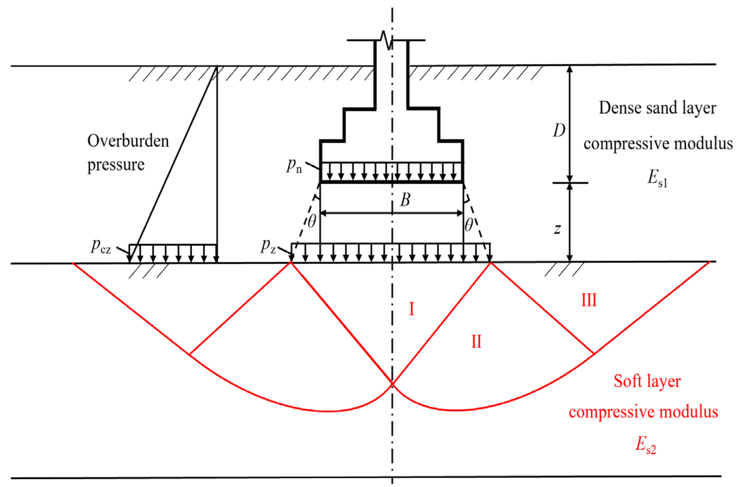 119]. The surcharge load on the foundation is distributed to the top surface of the underlying soft layer at a certain expansion angle (