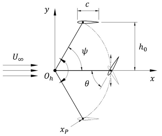 In terms of the moving trajectory of the hydrofoil, the FHT can be classified into pitch-heave, right-swing, and left-swing configurations. Looking at a creature’s motion in nature, the front flipper of a sea turtle is located at the rear position of its humerus, ulna, and radius bones. Due to the position, the anteroposterior motion of the front flipper is composed of only posterior motion, which is close to the trajectory of the right-swing configuration [22]. In addition, Hai et al. reported that the stability of the right-swing trajectory is superior to that of the others; thus, we adopted the right-swing configuration in this study [23]. As depicted in Figure 1, in a right-swing configuration, the pitch angle (θ) of the hydrofoil varies between positive and negative values due to the flow, causing the swing arm to oscillate about the flapping axis (Oh) and to move vertically. In this manner, the oscillating energy of the FHT then can be converted into mechanical and electrical energies for energy extraction.