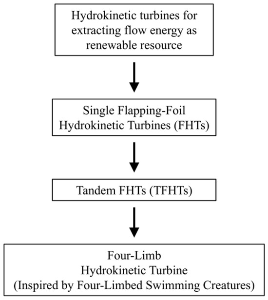 To date, TFHTs have been studied mainly focusing on front-rear kinematics of the tandem configuration, but in this study, inspired by four-limb swimming creatures such as turtles, a four-limb hydrokinetic turbine is designed to consider not only front-rear but also left-right kinematics based on the research flow as presented in Figure 2. The power performance is investigated by configuring the parameter sets with the optimal operating conditions, and a load analysis required for substructure design is also conducted.