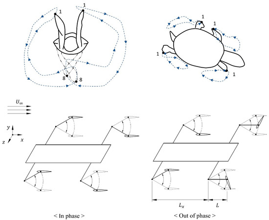 Nauwelaert and Aernts studied the movement of frogs and defined the in-phase condition as when the limbs of a four-legged swimming creature move simultaneously and the out-of-phase condition as when they move alternately, reporting that the in-phase condition is good for speed and that the out-of-phase condition is good for energy efficiency [29]. The turtles we aim to mimic in this study also use an in-phase condition when requiring large propulsive force and an out-of-phase condition when swimming normally. The main difference is that the turtle swims with most of its momentum in the downward stroke such that there is only one lift and drag peak per cycle, whereas the energy-extracting case utilizes lift in a symmetrical motion with both upward and downward swings. Therefore, the energy-extracting case has two peaks per cycle and can be considered to be in phase at 0 and 180 degrees, where the peaks on the front and rear hydrofoils are in phase, and out of phase correspondingly at 90 and 270 degrees, where the peaks are staggered. This concept can be applied to the four-limb hydrokinetic turbine system, as shown in Figure 4.