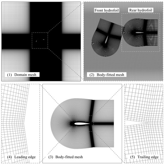 The four-limb hydrokinetic turbine has identical flapping kinematics on the left and right sides except for the phase between them, as depicted in Figure 4. We assumed no right-left interaction, which is expected to be minor; subsequently, for sake of analysis efficiency, 2D CFD analysis was conducted in order to explore the hydrodynamic characteristics of one side’s front-rear combination. For a performance comparison, a computational fluid dynamics (CFD) analysis was conducted using an in-house code (kflow), a parallelized multi-block-structural Navier–Strokes solver, which has been verified for its feasibility through previous studies [34,35]. The in-house code is based on an approach that combines the finite volume method (FVM) with transfinite interpolation [36]. The k-ω WD+ model, which was used in previous studies [34,35], was adopted as the turbulence model as well. The k–ω WD+ model was selected based on previous research [37], which demonstrated that it is less sensitive to typical wall spacing, provides better agreement with the experimental data used for validating weak nonlinear eddy viscosities, and incurs lower computational cost. In addition, a chimera method consisting of a domain mesh and a body-fitted mesh was used for the large movement of the foil. The boundary conditions of the grid system in Figure 5 (1) consist of an inlet located on the left line, an outlet located on the right line, and symmetry on both the top and bottom lines. The domain mesh has a size of 40 c × 40 c (196,542), as shown in (1) in Figure 5, and the body-fitted mesh is a combination of C-type and H-type meshes, as shown in (2) and (3), with the first layer (thickness of 1 × 10−4) perpendicular to the hydrofoil. Here, (4) and (5) show the mesh geometry near the leading edge and trailing edge, respectively.