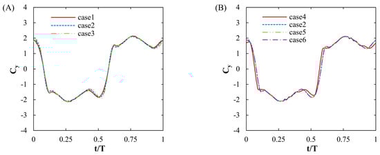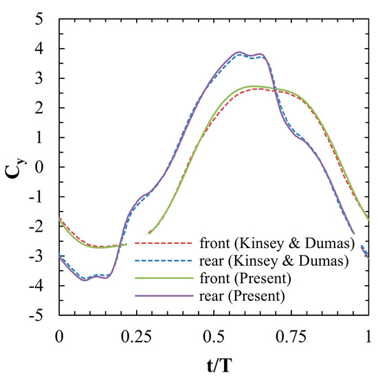 In order to check the convergence, the meshes of six cases were compared by changing the mesh density and the number of time steps. The mesh density, number of time steps, and number of flapping cycles were determined by referring to previous studies using the same CFD code as well [23,27,34,35]. In this case, f* was fixed at 0.12, other inputs were set as shown in Table 1, and the simulation was conducted with a single foil. When comparing case 1 and case 3 to case 2, as listed in Table 2, we find that the error in the efficiency is reduced from 2.08% to 0.07%. The results of previous studies were compared with the data from the final cycle of the five flapping cycles. In addition, when comparing the time steps, we observe that the error is 4.12% in case 4 but is reduced to 0.5% and 1.15% when there are 500 (case 5) and 600 time steps (case 6), respectively. Moreover, when comparing the Cy graphs in Figure 7, they show a similar shape with minor ripples. Accordingly, considering the analysis time, a subsequent analysis was conducted under the condition of case 2.