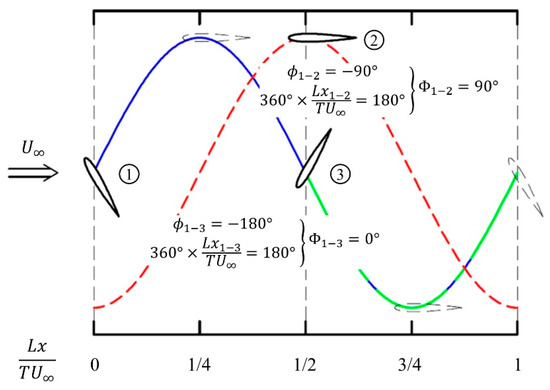 In Figure 9, the curves represent the vertical moving trajectory versus time in a period of each hydrofoil, and the hydrofoils of the solid line represent their positions at the same time, where Lx/TU is halfway between 1 and 2 as well as between 1 and 3. The global phase is 90 degrees for the out-of-phase condition (1–2) with an actual phase of −90 degrees, and the global phase is 0 degrees for the in-phase condition (1–3) with an actual phase of −180 degrees. Because the system geometry in Figure 3 is symmetrical from side to side, we initially examine the effect of the front-rear phase to determine how Lx and the phase affect the power performance. We divided the front-rear phases into in-phase and out-of-phase conditions according to their respective differences and determined the analysis conditions by considering the optimal range of the global phase, which is around 90 degrees, as suggested in previous studies. Then, the flow rate conditions were set to 0.9 and 1.2 m/s, and Lx was set to have a value close to 90 degrees for the global phase difference in the range of f* of 0.1 to f* of 0.14, which showed optimal efficiency when the pitch angle was 70 degrees, as reported in a previous study [20].