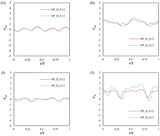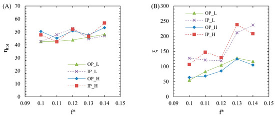 In order to compare the effect of the load in the f* of 0.12 condition, which showed relatively excellent power performance above, a load analysis was conducted to compare the effects of the load under both the in-phase and out-of-phase conditions. These results are shown in Table 4 and Figure 17.