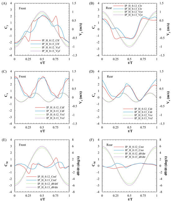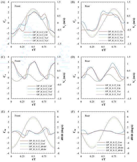Force and power coefficient curves for the in-phase condition. ((A): Front Cy, (B): Rear Cy, (C): Front Cx, (D): Rear Cx, (E): Front CM, (F): Rear C, (G): Cpx, (H): Cpy, (I): Cpz, (J): Cp).
