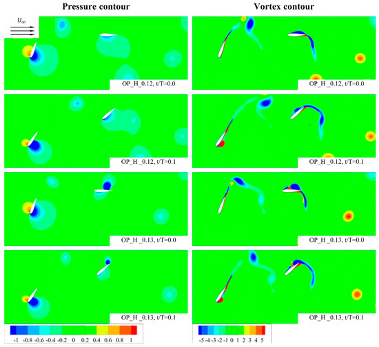 Comparing the out-of-phase conditions in Figure 11, the total power coefficient graph (Figure 10), of which the values were calculated with the span length of the hydrofoils given by unit length, shows that the curves at f* of 0.13 fluctuate more than those at f* of 0.12. In particular, around t/T = 0.1, the power drops significantly in the f* of 0.13 (Cp of 0.54) case compared to that of f* of 0.12 (Cp of 1.36). The drop in the case of the f* of 0.13 was mainly due to the drops of PY and PZ in Figure 11H,I. Meanwhile, the power values due to the drag in Figure 11G were oscillated along the horizontal line of Px = 0 with similar positive and negative amplitudes. To find the cause of the drop, the pressure and vortex (vorticity, 1/s) distribution between t/T of 0 and t/T of 0.1 are depicted in Figure 12.