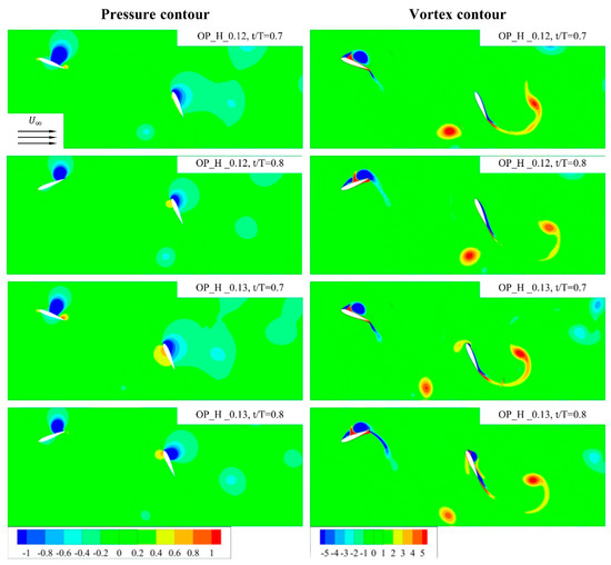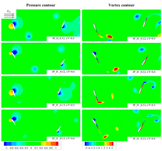 Next, we analyzed the force and power coefficient curves for the in-phase condition, which were depicted in Figure 14. When comparing the in-phase condition in Figure 14, we find that the total power graph fluctuates more at f* of 0.13 than at f* of 0.12, matching the out-of-phase condition in Figure 11. In particular, at values between t/T of approximately 0.3 and t/T of approximately 0.4, the power drops significantly in the f* of 0.13 condition compared to the f* of 0.12 condition. To find the cause of this, the pressure and vortex distributions between t/T of 0.3 and t/T of 0.4 are presented in Figure 15.
