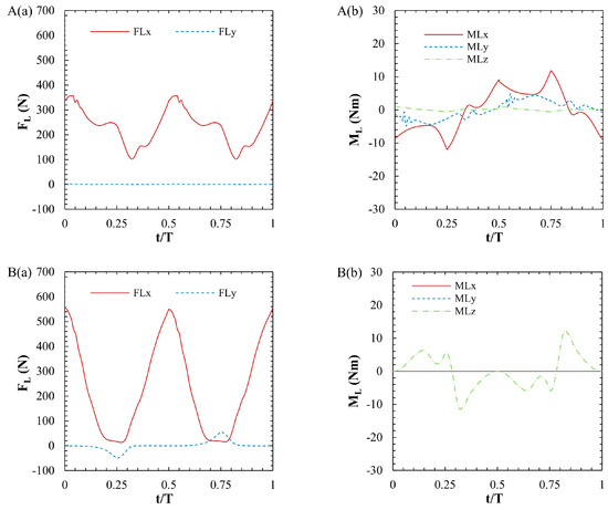 First, regarding the force, the drag force (FLx) in the out-of-phase condition has the largest value, and it can be seen that the maximum magnitude and range of the load are significantly correspondingly reduced to 64% and 47% as compared to those of the in-phase condition. In addition, for the lift force (FLy), it can be seen that the maximum magnitude and range of the load are significantly reduced to 4% and 3%, respectively, when the two sides differ in the 180-degree phase, as in the out-of-phase condition, due to the effect of the lift force of the two sides being canceled. On the other hand, in the out-of-phase condition, the 180-degree phase difference between the two sides resulted in a slightly different FLx value between the downward and upward swings, resulting in a yaw moment (MLy) of 11.89 Nm, but the difference in FLy was not significant, resulting in a body pitch moment (MLz) of 4.9 Nm. For the in-phase condition, MLy and MLx would have been zero due to FLx and FLy in the same swing direction, but instead, the body pitch moment (MLz) was 12.39 Nm due to FLy in the same direction. In other words, by selecting the out-of-phase condition, the loads by the drag and lift forces were mainly reduced, while the reduction of the moment is minor.