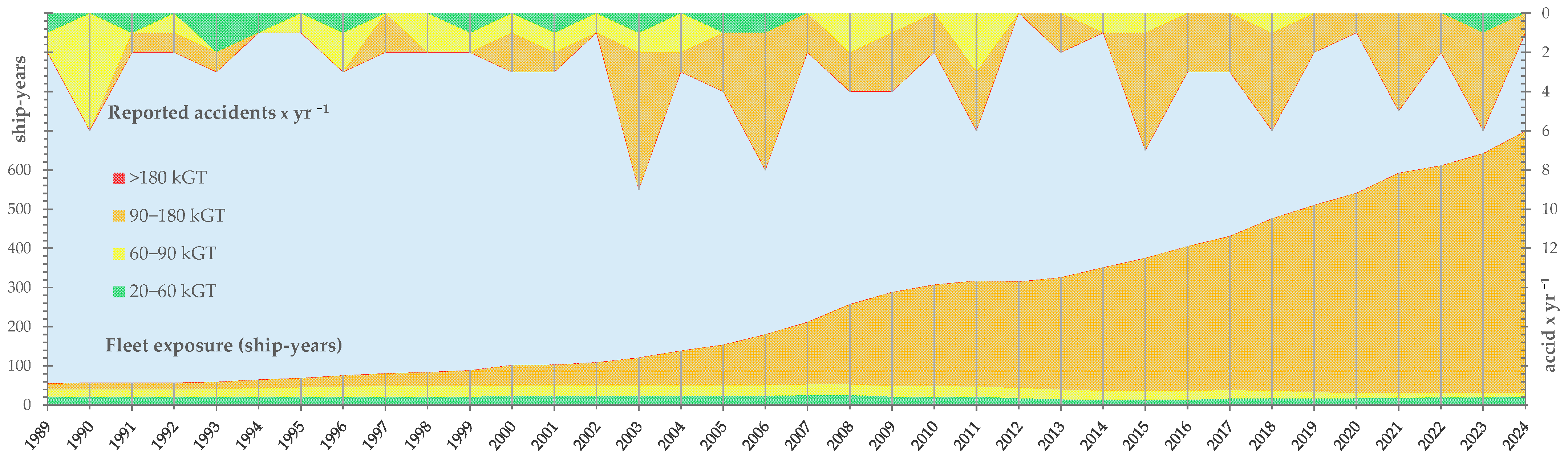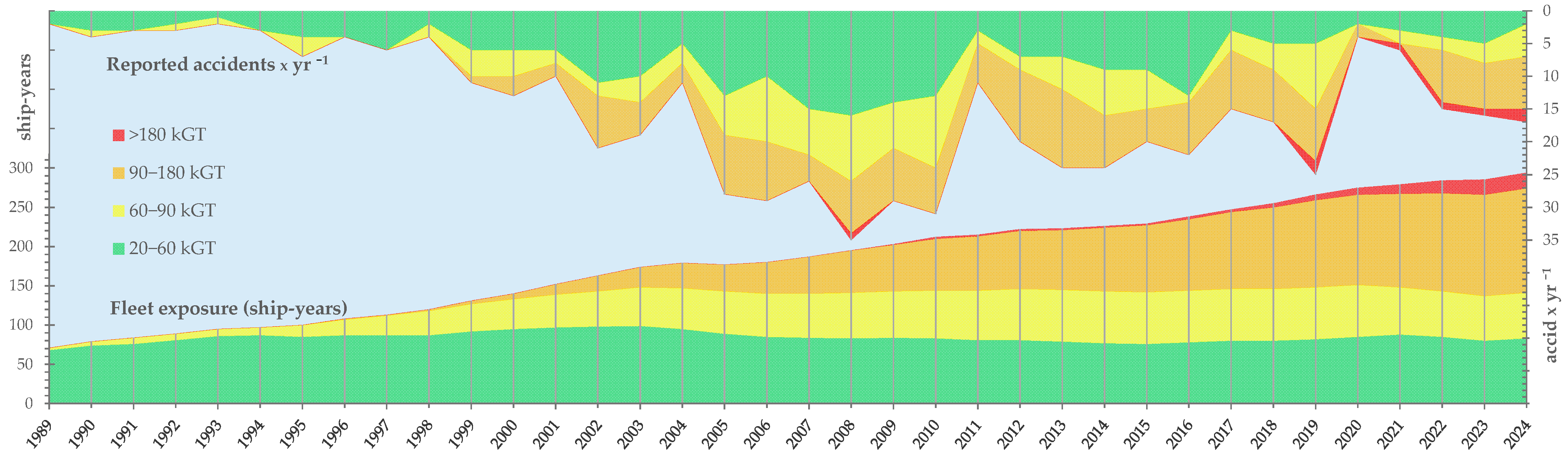Figure 1 shows a graphical representation of fleet exposure by gross tonnage and the distribution of accidents within each class. As expected, most accidents are concentrated in the smaller ship classes, where fleet exposure is also highest. Conversely, the largest ship class has the lowest number of accidents, which is primarily due to the relatively recent emergence of cruise ships of more than 180,000 GT, which only entered service from 2008 onwards.