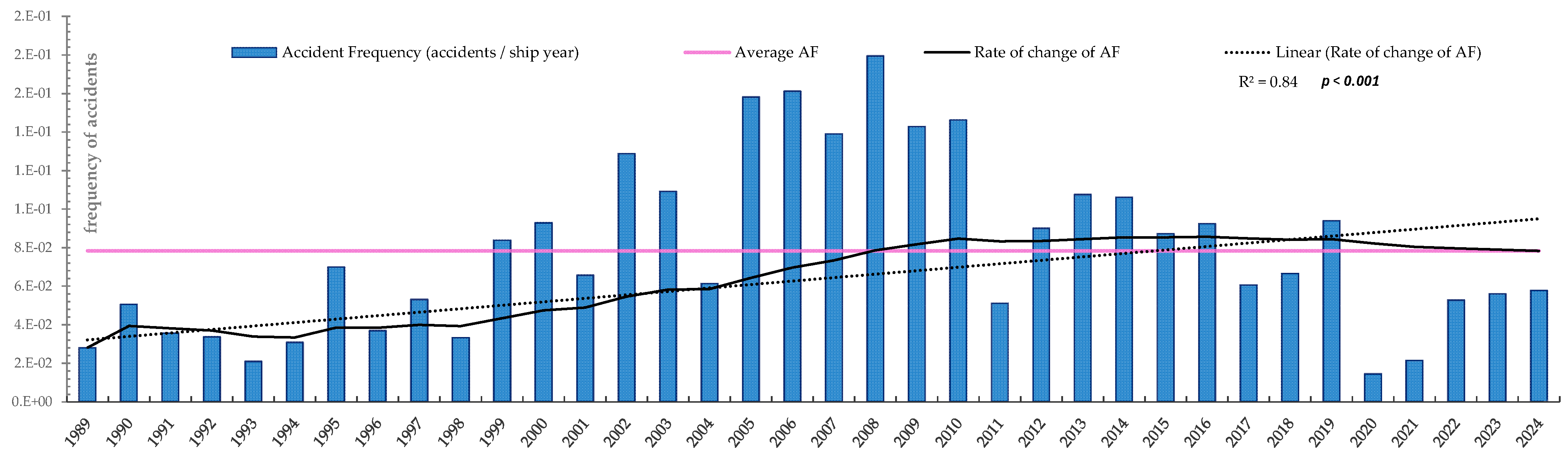 The 90,000–180,000 GT segment deviates slightly with a relative risk value of 1.13, suggesting that the ratio between accident frequency and exposure is slightly higher than expected. The lowest ratio, 0.92, was observed in the largest ship class. The table also shows the calculated accident frequencies and the normalised proportion of accident frequency in the individual classes. The calculated accident frequency (Figure 2) per ship year is shown with bars. While short-term fluctuations can be observed, the long-term trend shows a gradual increase in accident frequency. To reduce short-term fluctuations in the data, we have introduced an additional indicator, the so-called accident frequency rate of change, defined as the annual change in the average accident frequency per fleet year. This measure provides a smoothed representation of long-term developments and enables a more reliable trend analysis than the raw annual frequencies. The regression analysis of the rate of change in annual accident frequency for cruise ships shows a statistically significant positive slope (R2 = 0.84, p < 0.001), indicating a slight but steady increase in recorded accidents over the observation period. Recently, however, there have been signs of stabilisation, possibly due to the effects of improved ship design, regulatory measures, automation, and risk management systems. Continued monitoring and analysis remain crucial to determine whether the safety measures introduced are effectively mitigating the risks of the growing cruise fleet.