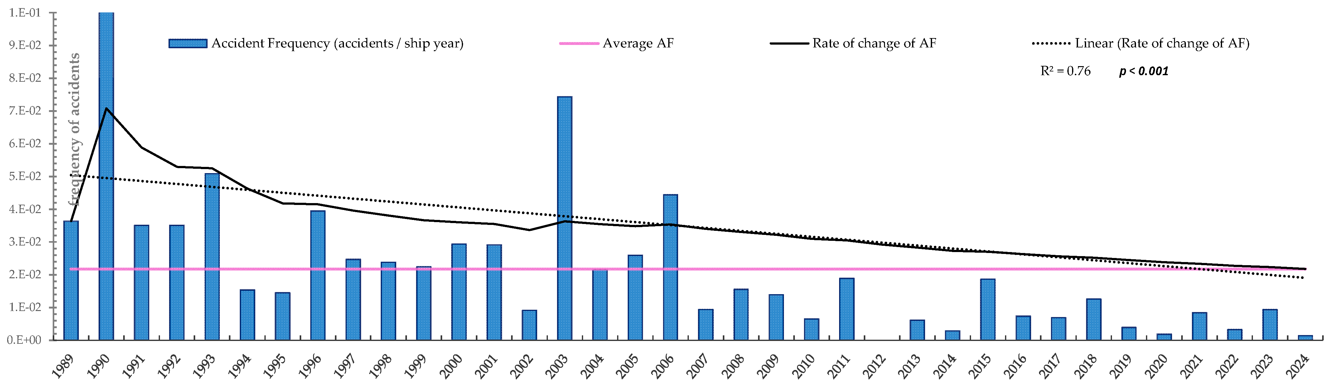 Figure 4. Accident frequency per LNG tanker year with trend line. Regression analysis of the rate of change shows a statistically significant negative slope (R2 = 0.76, p < 0.001), indicating a gradual long-term decrease in accident frequency.
