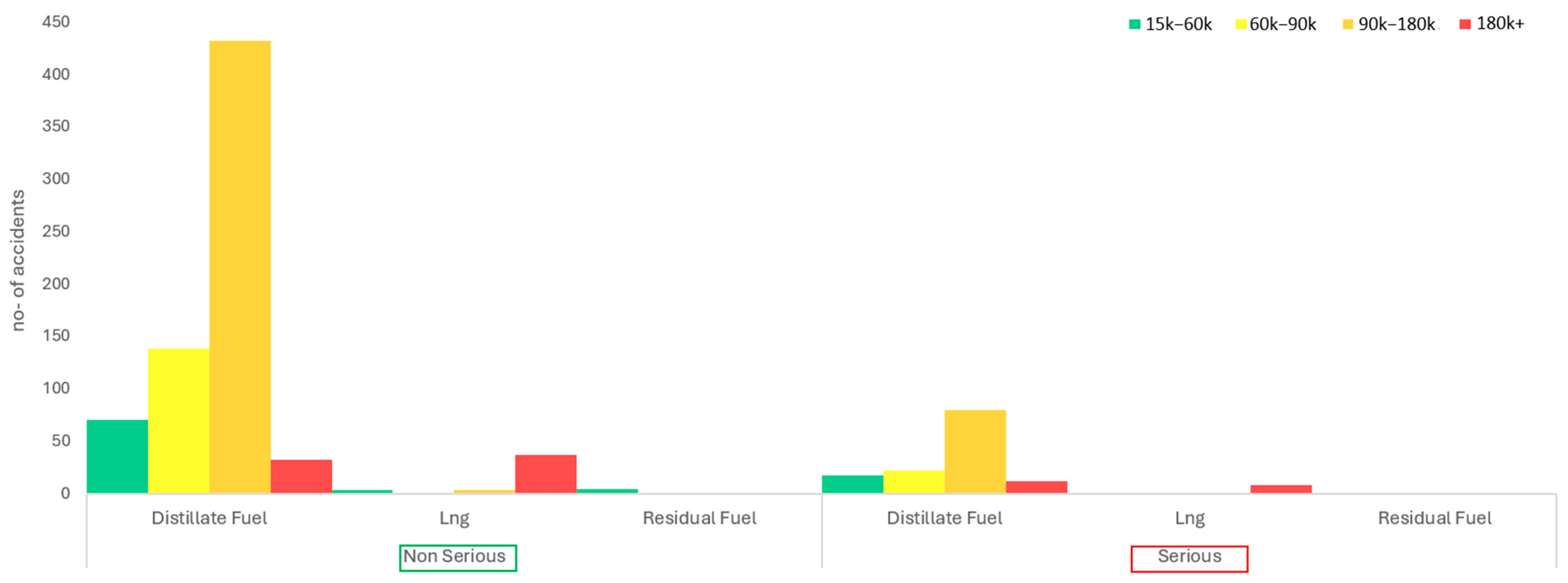 Figure 5. No. of cruise ship accidents 2018–2024 grouped by fuel type and seriousness.