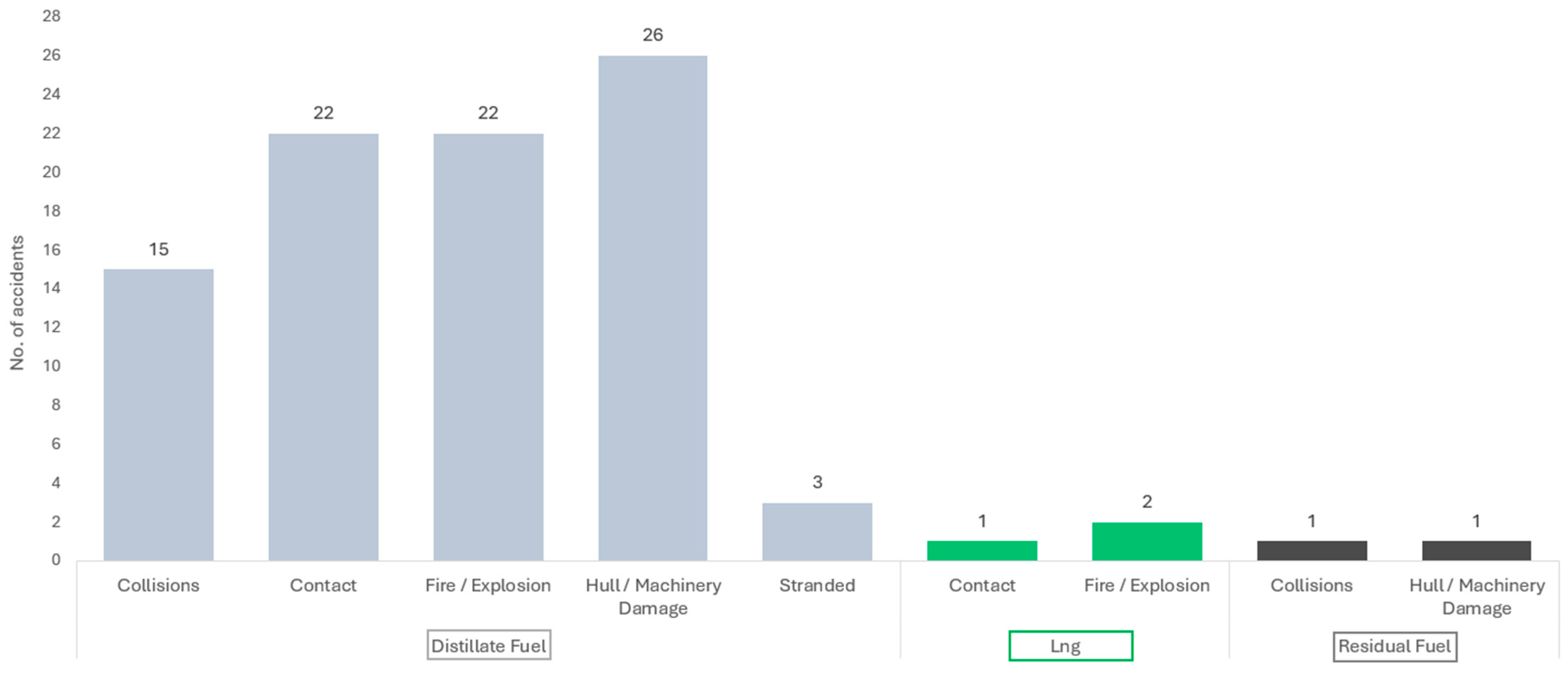 In contrast to Figure 5, which includes all accident types, Figure 6 focuses exclusively on operational accidents related to ship management, excluding incidents involving injuries to crew and passengers, falls overboard or other health-related incidents. For distillate-fuelled vessels, 11% of all recorded accidents fell into this category, including 15 collisions, 22 contacts, 22 fires/explosions, 26 cases of hull or machinery damage, and three strandings, see Table 4.