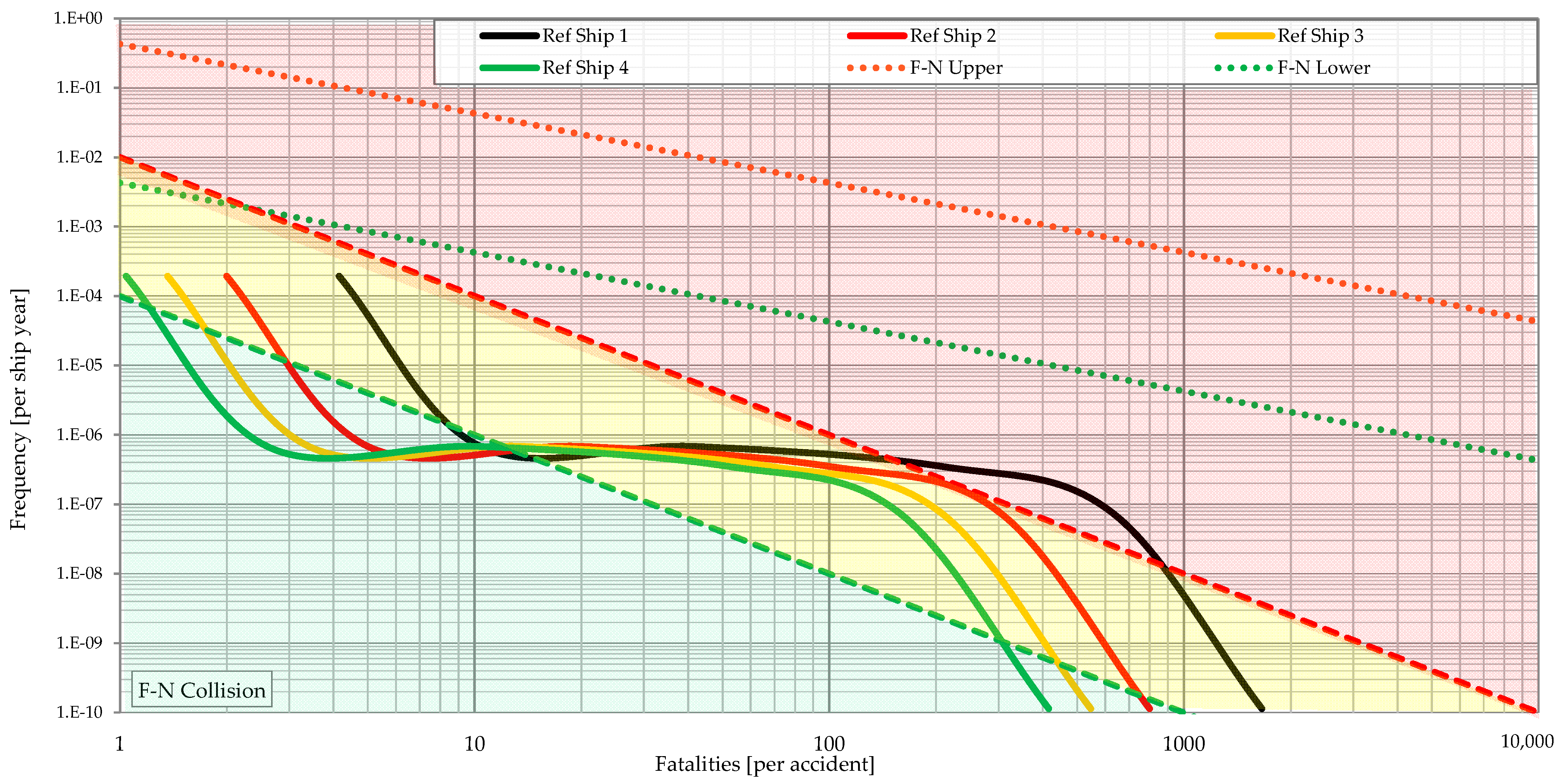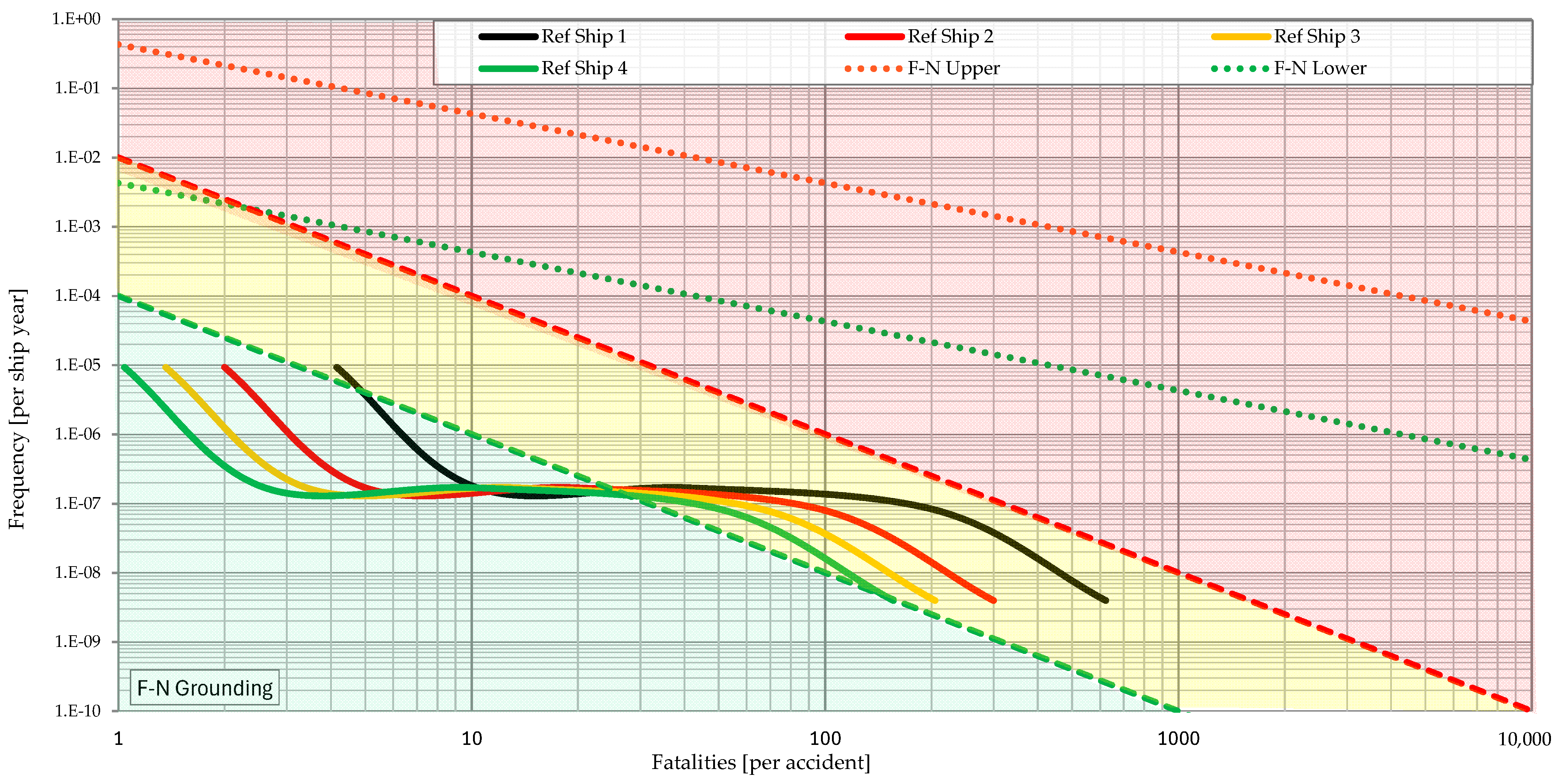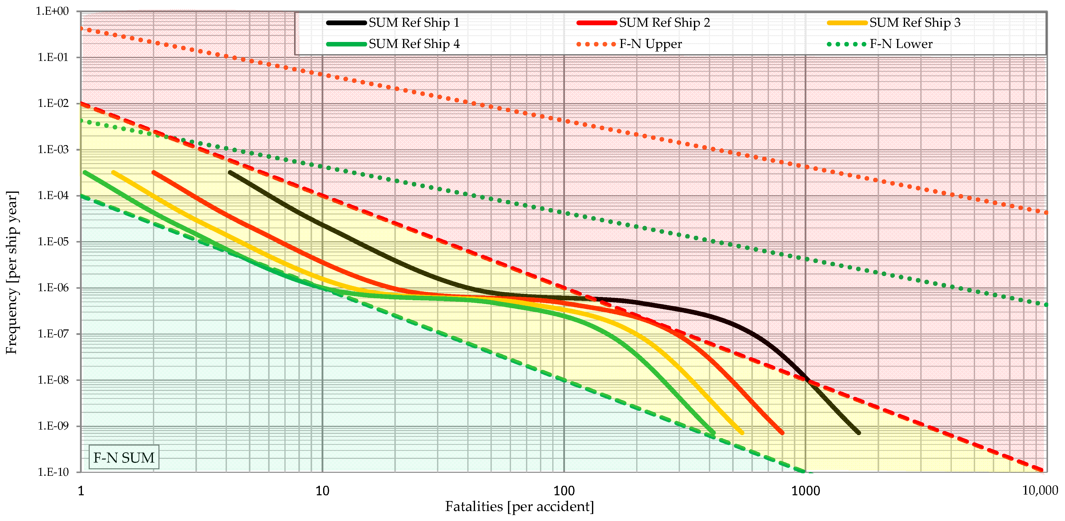 where F1 represents the frequency of incidents resulting in one or more fatalities, and N denotes the number of individuals on board per ship. The calculated tolerable risk for 2024 is 4.28 × 10−2 fatalities per year. According to [59], the upper tolerable limit is determined by multiplying this value by 10, while the lower limit is obtained by dividing it by 10. However, as discussed in the introduction, only the lower boundary can be considered a reliable reference. In contrast, the upper limit is subject to further reduction based on company-specific safety policies. In risk assessment practice, the calculated risk value is generally regarded as an upper boundary that should not be exceeded. Annual statistical variations influence the upper threshold of the ALARP region; a notable shift in fatality frequency trends occurred following the Costa Concordia disaster in 2012, which elevated risk levels in subsequent years, maintaining a higher baseline compared to pre-incident levels.