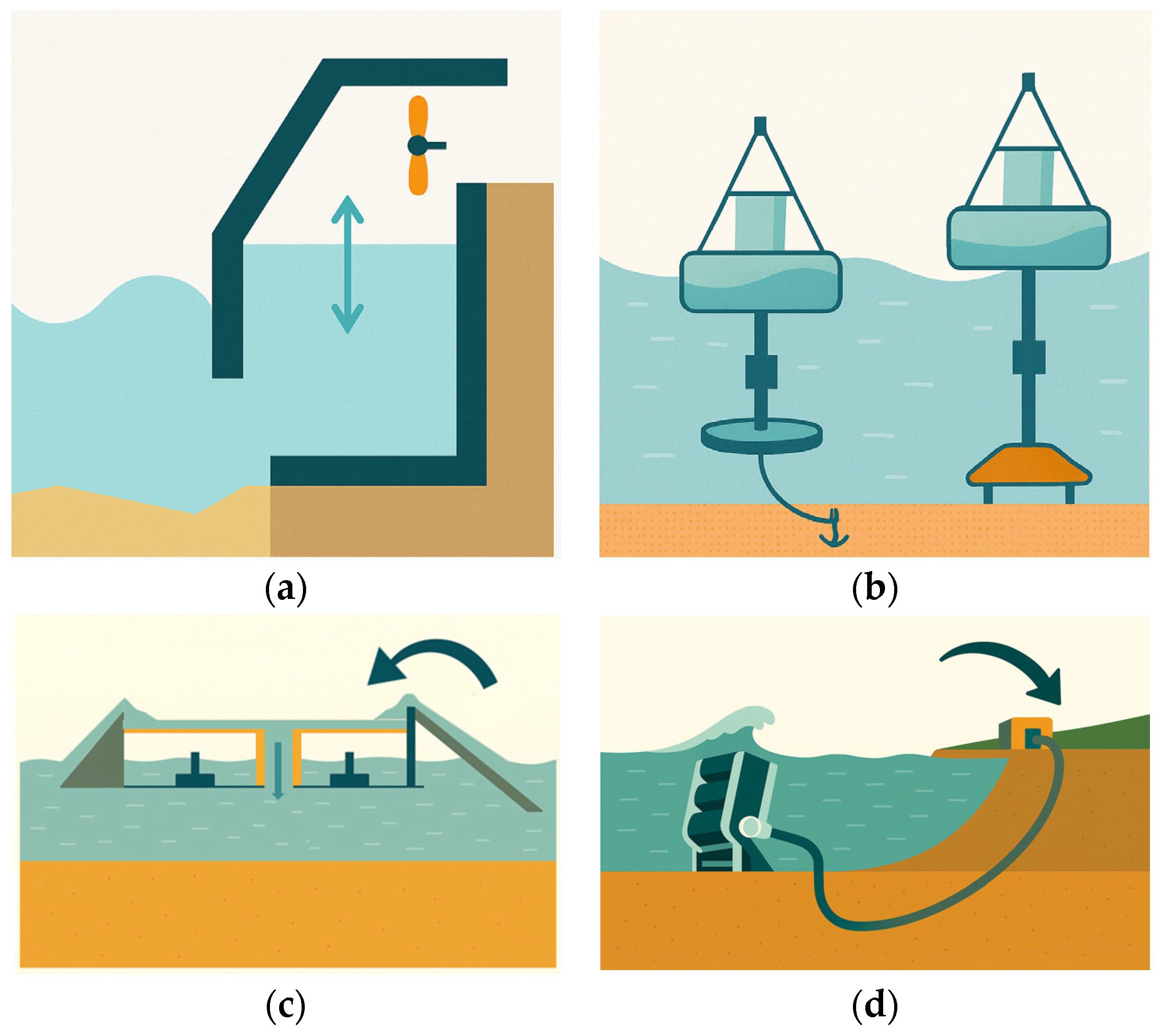 | TRL | 5 | Deployed in Mutriku, Pico—TRL 9 [6,7,56] | 4 | Numerous prototypes at sea; TRL 7–8 [6,11,32] | 3 | Wave Dragon, CROWN at TRL 6–7 [6,7,56] | 3 | Tested at small scale; limited full deployments [6,11,32] |