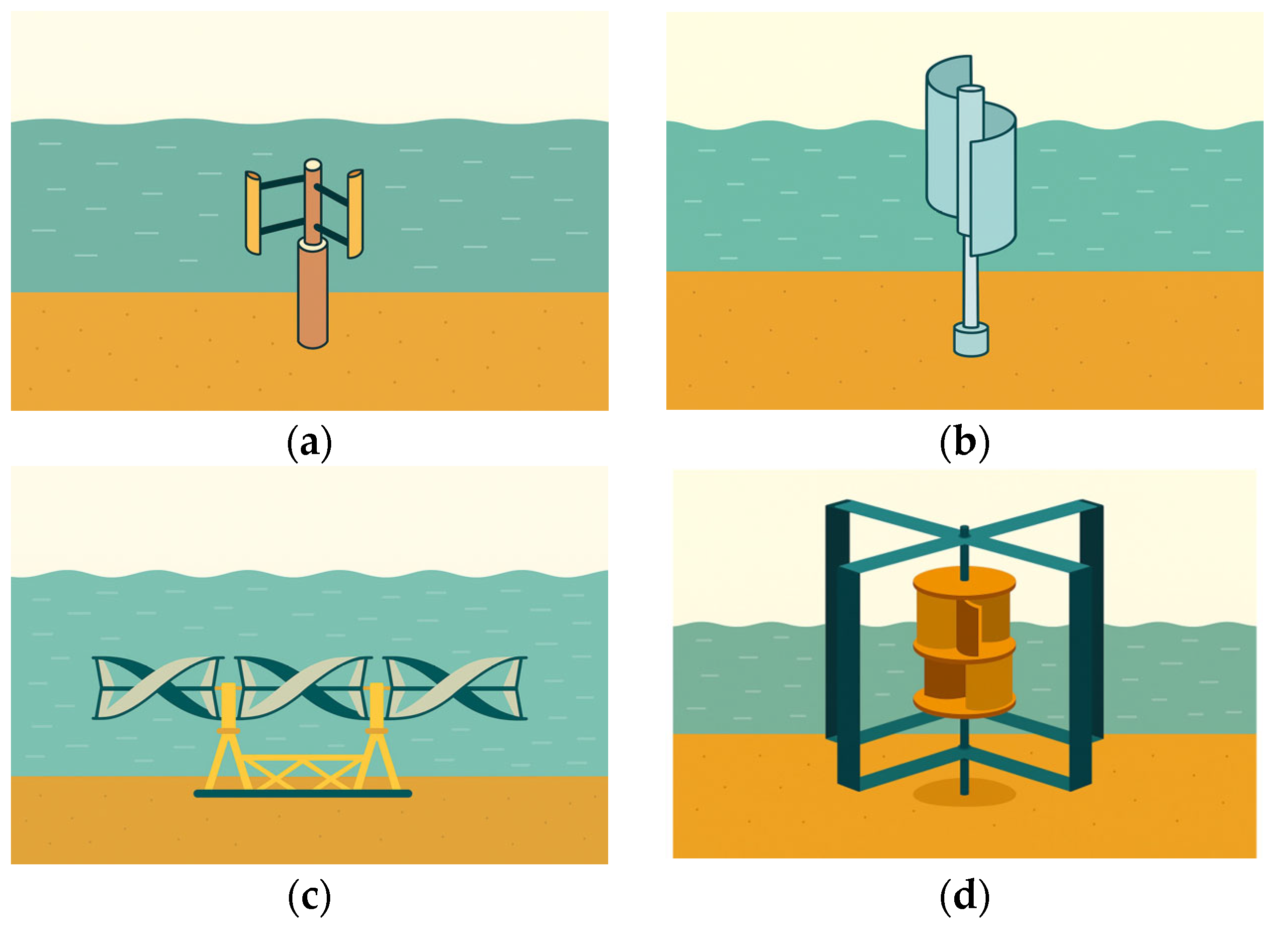 | Installation Complexity | 3 | Requires alignment systems; moderate installation needs [36,38,61] | 3 | Similar mounting to Darrieus; helical adds minor complexity [31,39,43] | 4 | Compact unit; low logistics [41,42,62] | 4 | Modular shallow-depth install [11,31,43] |