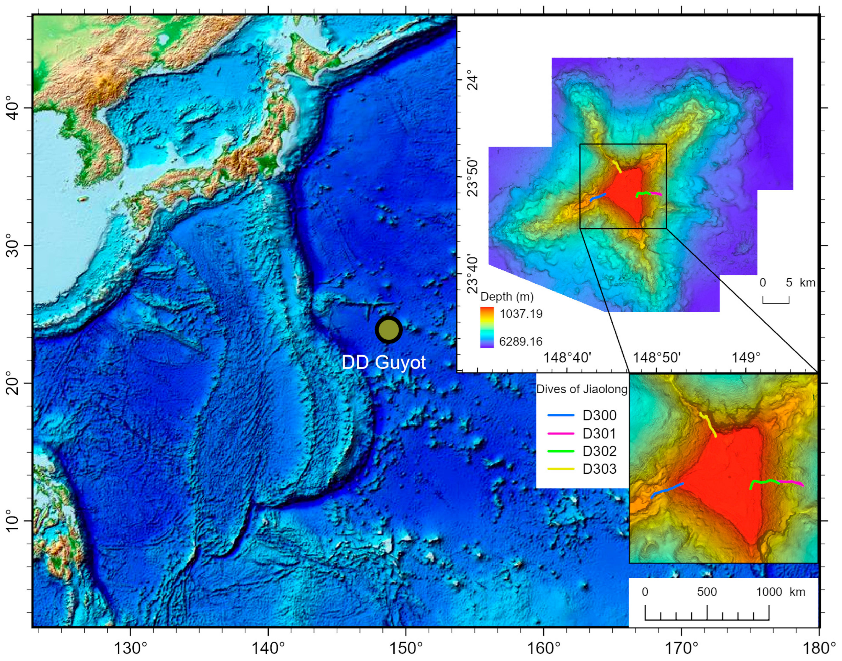 Location and morphology of the DD Guyot, and the dive trajectories of the manned submersible Jiaolong.