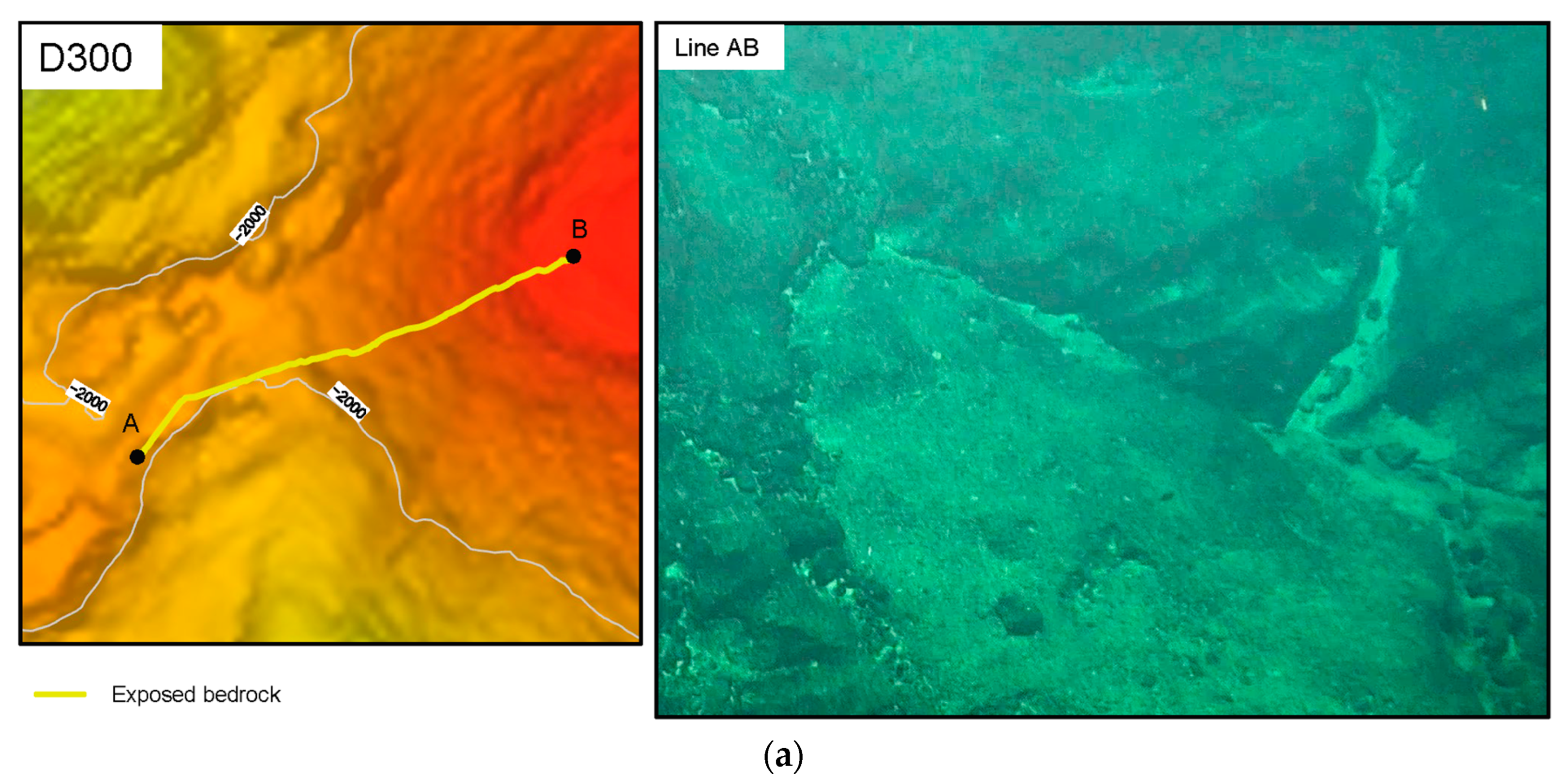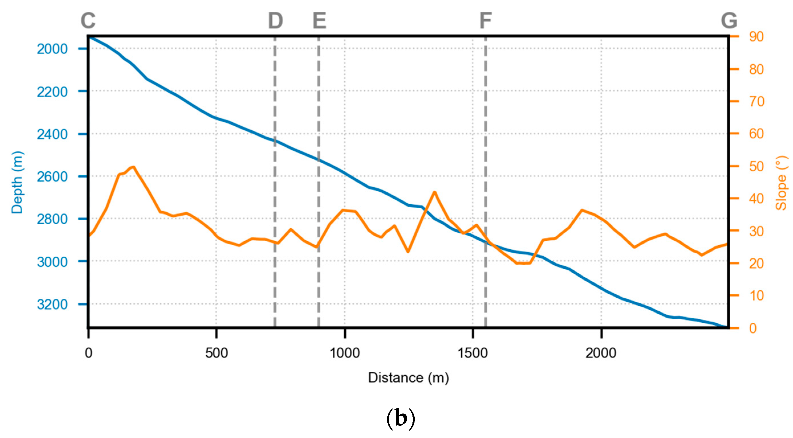Sediment distribution characteristics along the D300 trajectory line, along with corresponding depth and slope values. (a) Location and video image; (b) depth and slope profile.