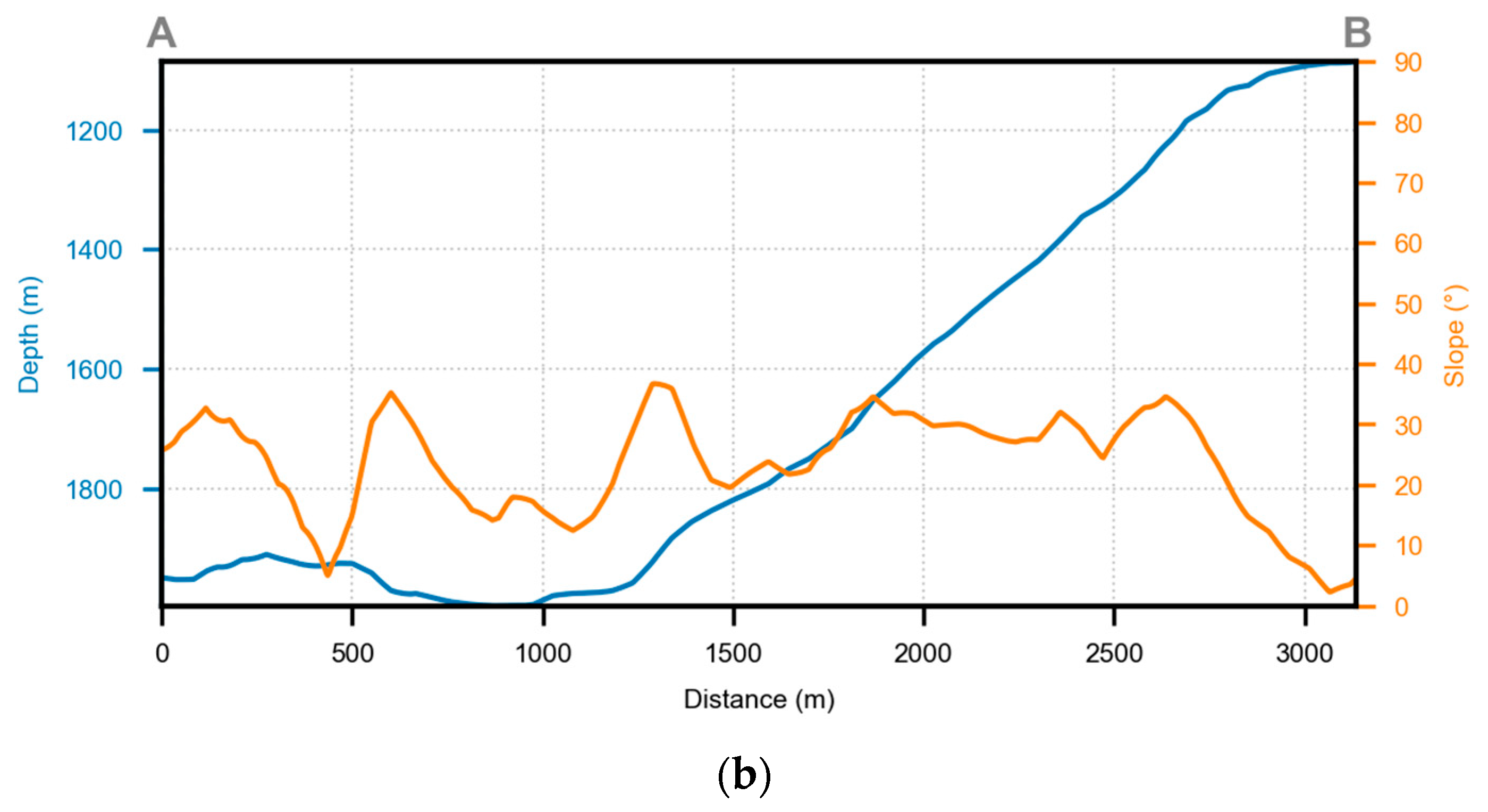 Number | Trend | Length (m) | Width (m) | Mean Slope (°) | Sedimentary Features |