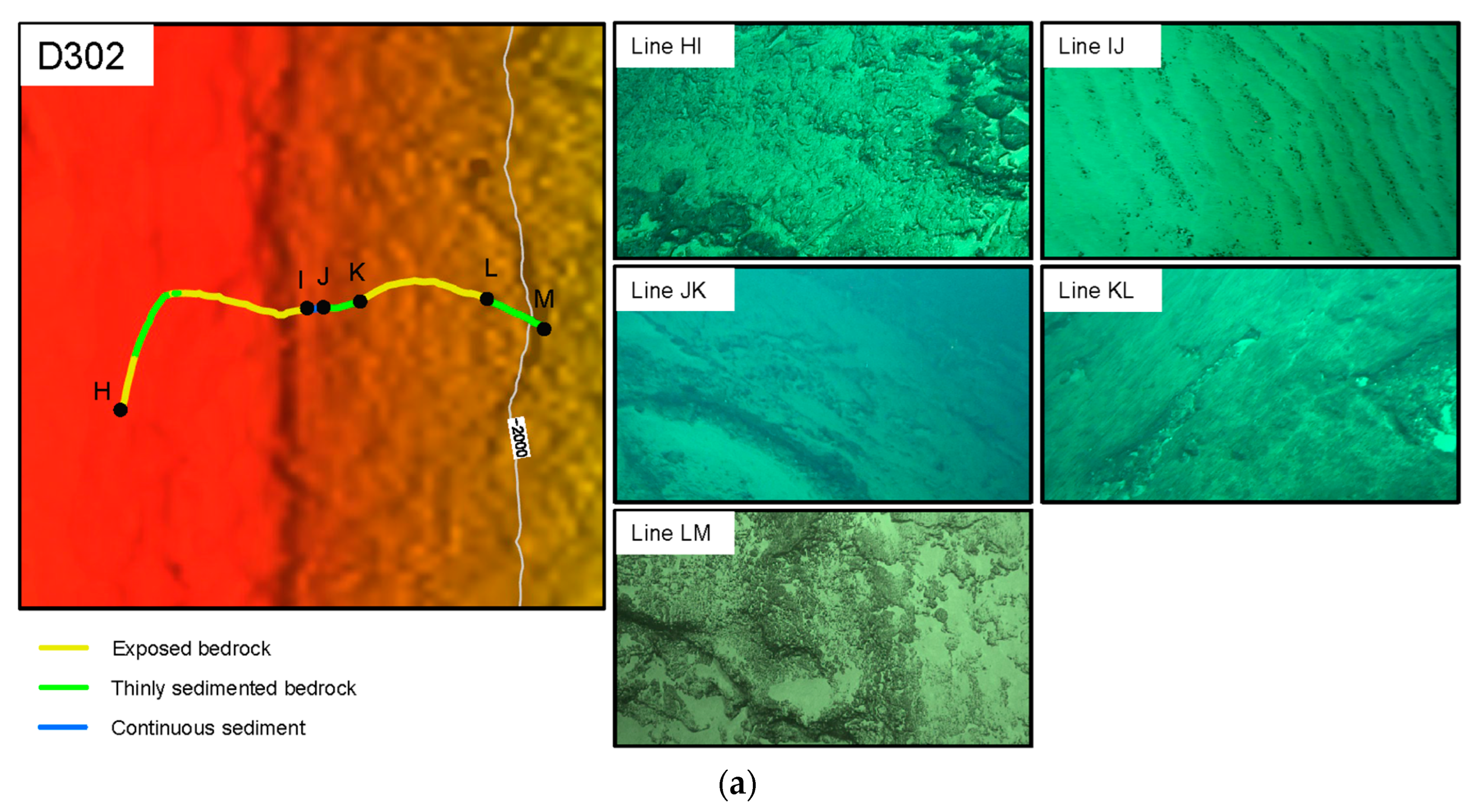 Sediment distribution characteristics along the D302 trajectory line, along with corresponding depth and slope values. (a) Location and video image; (b) depth and slope profile.