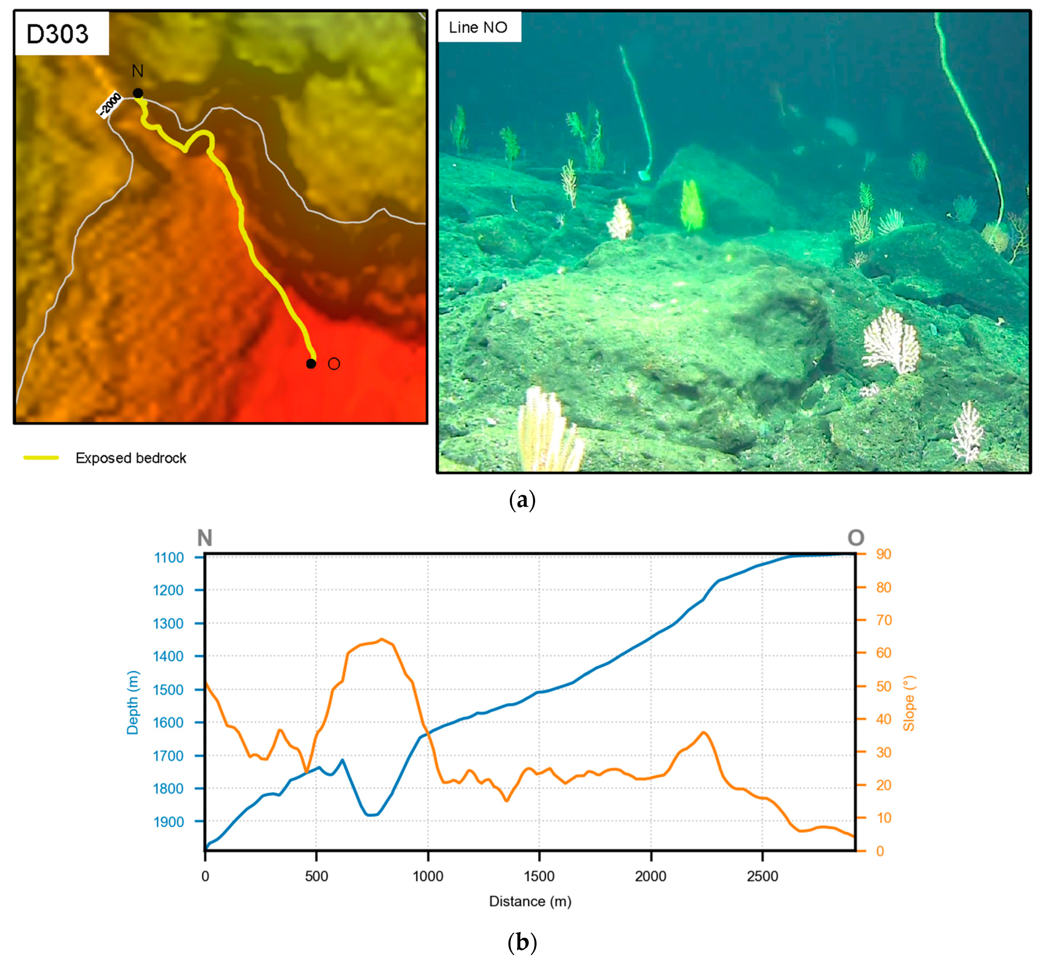 Sediment distribution characteristics along the D303 trajectory line, along with corresponding depth and slope values. (a) Location and video image; (b) depth and slope profile.