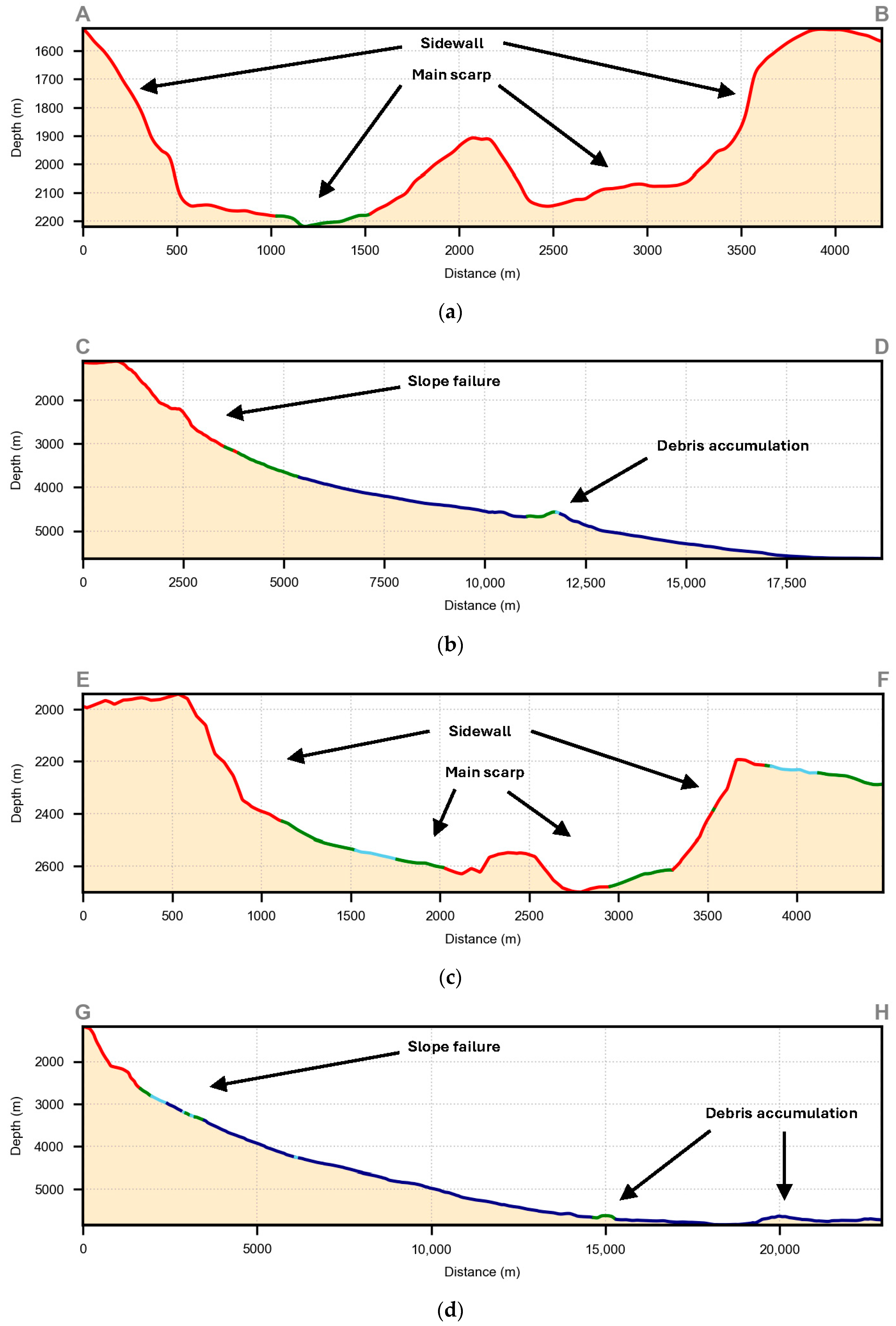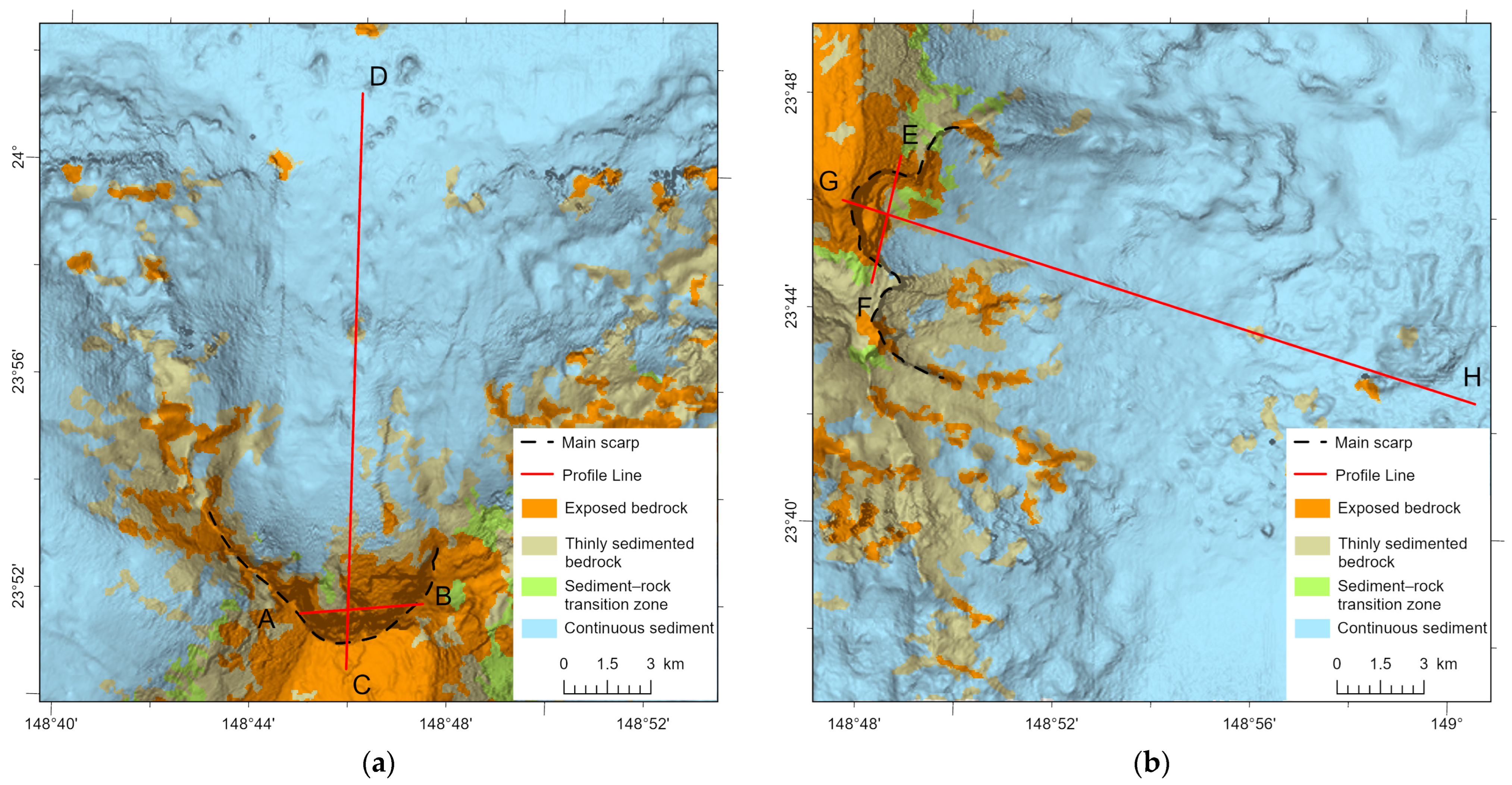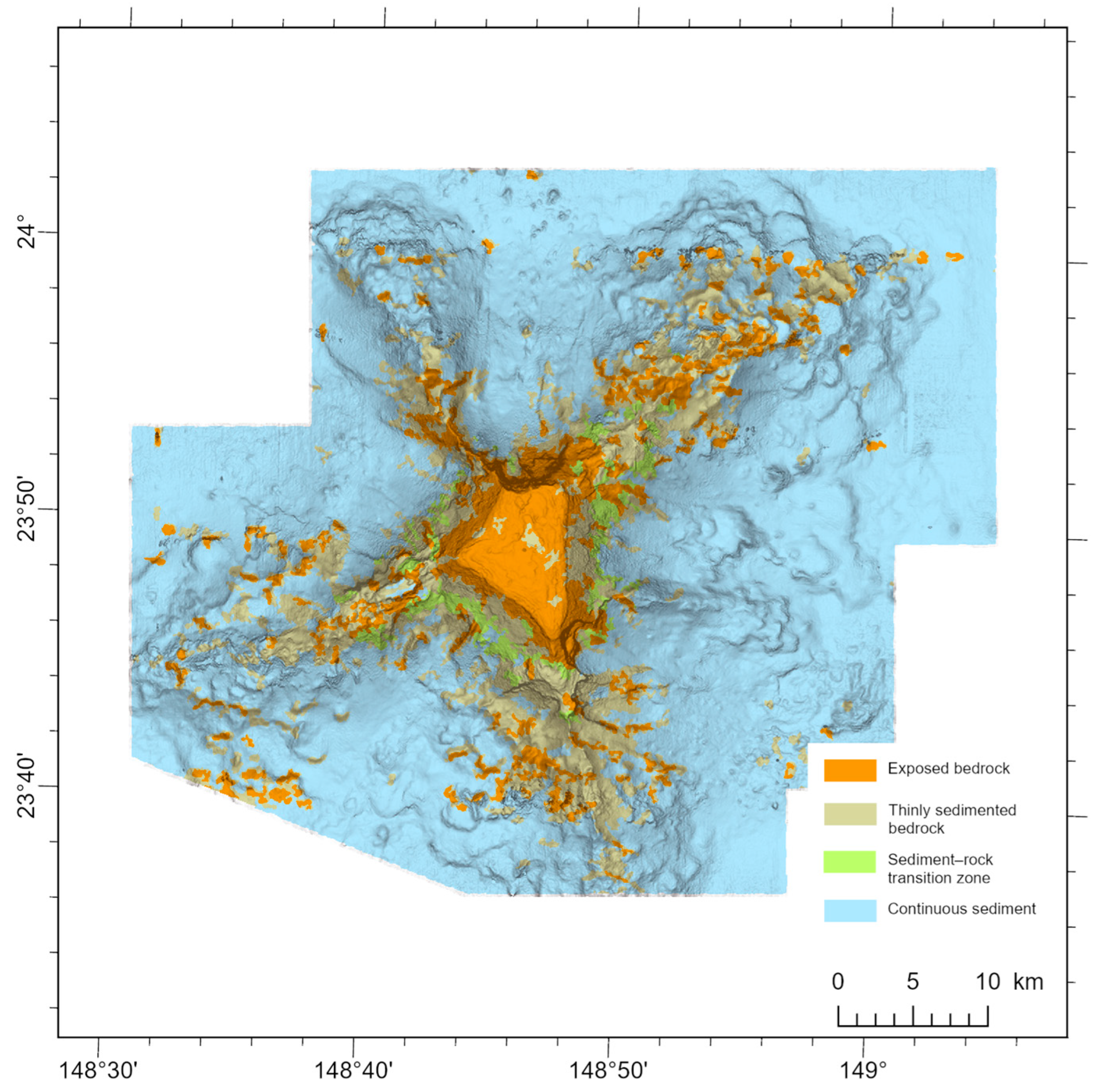 Figure 11. Profile lines indicate different substratum types with distinct colors: red for exposed bedrock, green for thinly sedimented bedrock, light blue for the sediment–rock transition zone, and dark blue for continuous sediment. Light brown indicates the guyot.