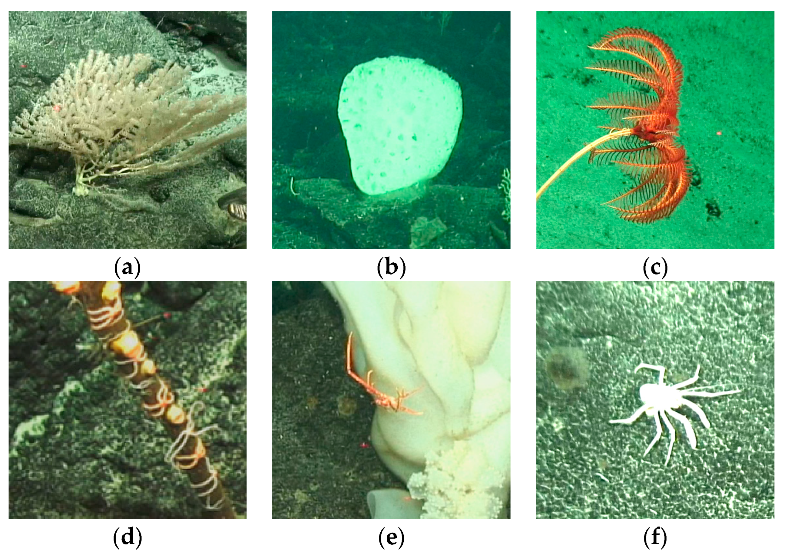 Common benthic organisms seen by the Jiaolong submersible: (a) coral, (b) sponge, (c) sea lily, (d) brittle star on dead sponge, (e) decapod shrimp, and (f) squat lobster.