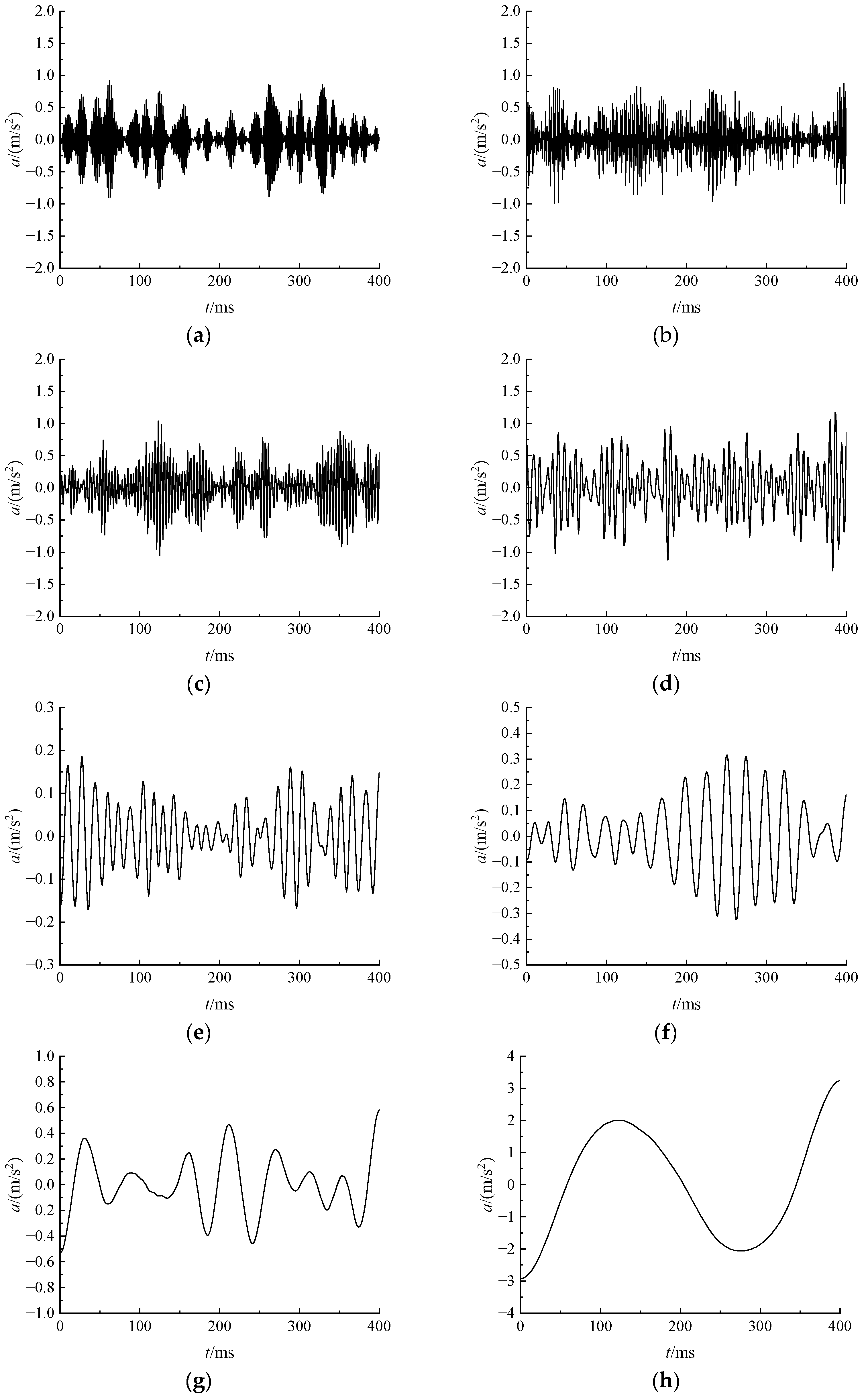 Figure 1 displays the vibration acceleration signal contaminated by direct current offset and random noise. The waveform exhibits both low-frequency drift components and high-frequency random disturbances, characterized by typical non-stationary features. The sampled signal was decomposed using Variational Mode Decomposition (VMD), yielding nine Intrinsic Mode Function (IMF) orders and one residual term. The relevant results are illustrated in