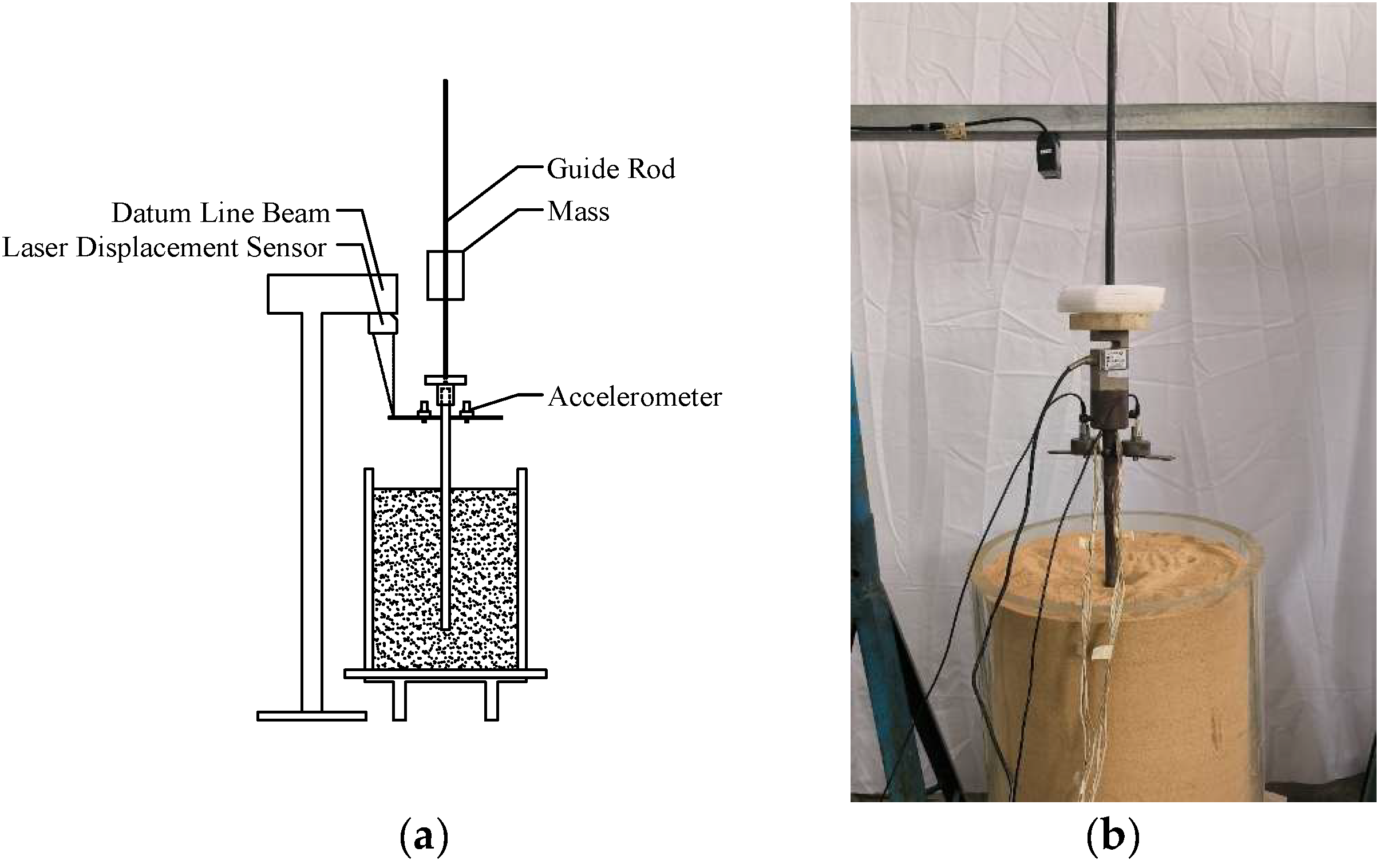 The system consists of loading system, Guide Rod system, cushioning system, sensing and acquisition system and model piles. A stable directional loading force is generated by the dropping mass and the guide rod. A Keyence IL-300 non-contact displacement sensor was installed on a datum beam, while an accelerometer was rigidly attached to the cap plate on the pile head.