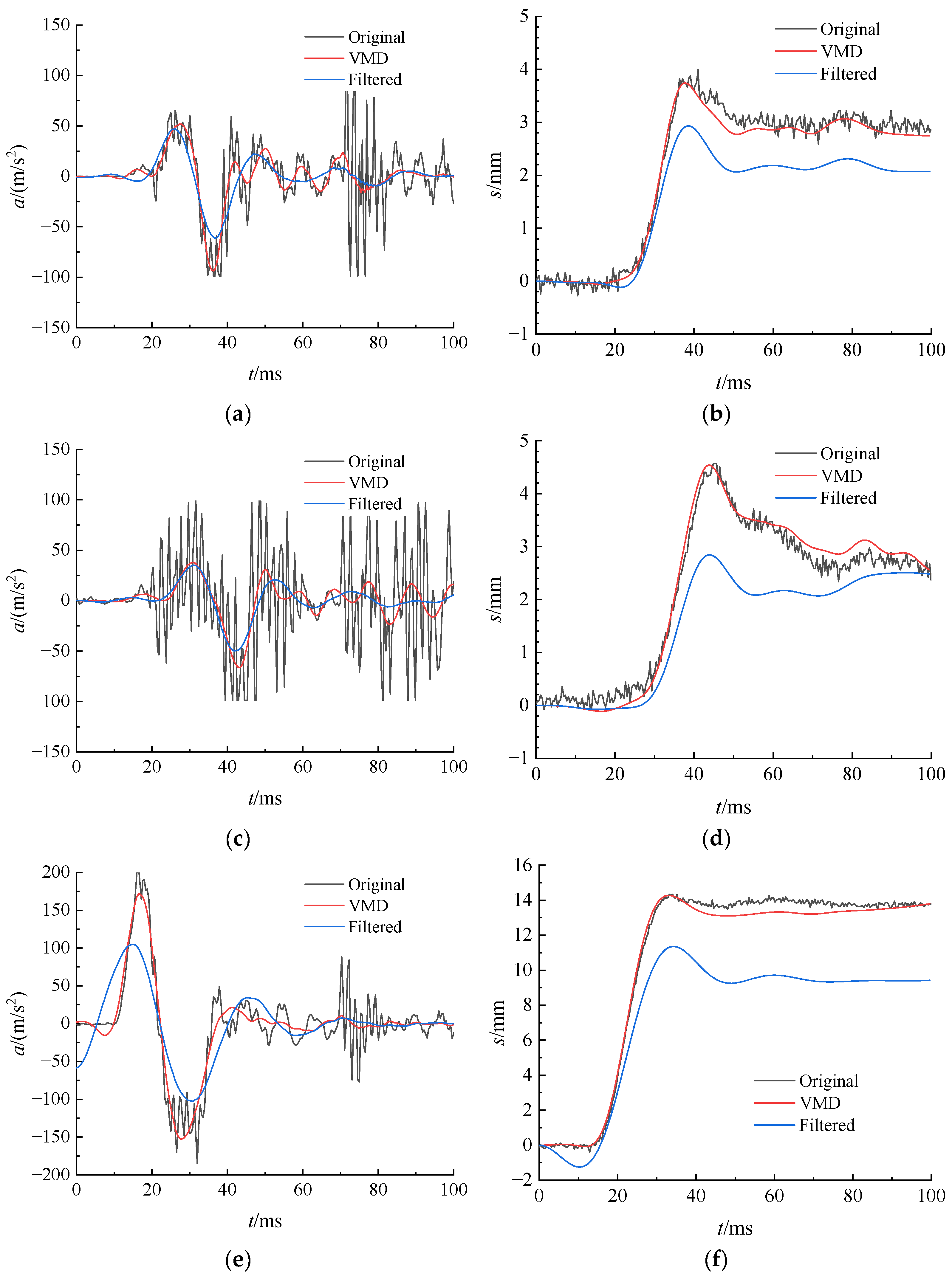 At the 400 ms, the ideal displacement value was 0.1273 mm. The displacement derived from the conventionally filtered signal was 0.1293 mm, while that from the VMD-reconstructed signal was 0.1279 mm. This result indicates that the VMD-reconstructed signal improved displacement accuracy by 1.1% compared to the filtered signal, demonstrating a clear enhancement. Further in-depth analysis of the entire time history curve clearly reveals that the VMD-reconstructed signal not only aligns more closely with the ideal values at this specific point but also maintains superior consistency throughout the overall velocity and displacement profiles.