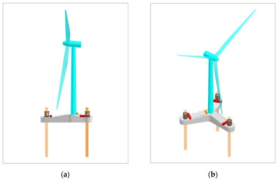 Configuration of the jack-up-type 10 MW OWT: (a) side view, (b) perspective view.