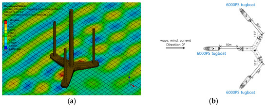 The validity of the proposed anchor-free installation method was verified through numerical analysis. The objective of the verification was to confirm that the pulling force provided by the tugboat fleet does not exceed the towline’s Safe Working Load (SWL) or the tugboats’ Effective Bollard Pull (BPeff). To this end, as described in Section 3.1 and Section 3.2, MOSES and AQWA were employed to evaluate the external forces induced by waves, wind, and current. The calculated forces were applied under both operational conditions (OPWF) and design conditions (OPLIM) to account for a range of environmental scenarios.