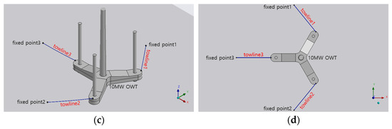 Figure 3 presents the AQWA analysis model developed in this study. (a) shows the hydrodynamic mesh of the 10 MW OWT and the resulting wave elevation, which were used to evaluate wave, radiation, and added mass coefficients. (b) illustrates an example of tugboat arrangement under an environmental load acting from the 0° direction, demonstrating how the tugboats provide restraining effects through towlines connected to bollards on the pontoon deck. (c) depicts a three-dimensional model including the bollard–towline–fixed point connections, while (d) shows the same configuration in a top view. Through this modeling, the interaction between the 10 MW OWT and the towline system was numerically represented, forming the basis for the motion response analysis in the frequency domain.