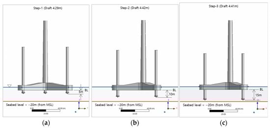 Step 1 corresponds to the initial installation stage, in which the spudcans are lowered to –5 m from the baseline (BL) and the pontoon remains in a non-flooded condition. At this stage, the pontoon draft was calculated to be approximately 4.29 m. Owing to the characteristics of jack-up-type offshore structures, most of the legs are exposed above the water surface in this step, resulting in increased sensitivity to long-period environmental loads.