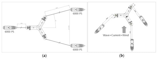 Figure 5 illustrates the variation in tugboat arrangement under the proposed installation method. (a) shows the basic configuration during the transportation stage, where two tugboats are positioned symmetrically at the bow and one is positioned at the stern. (b) depicts the installation stage, in which the tugboats are repositioned to align with an environmental load acting from the 90° direction. This demonstrates the principle by which the tugboat fleet suppresses drift and maintains the position of the 10 MW OWT.