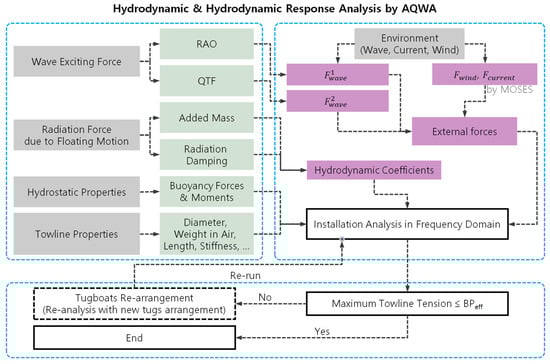The analysis and verification procedure of this study is illustrated in Figure 6, which stepwise presents the process from environmental load estimation to towline tension verification, and, if necessary, tugboat re-arrangement and iterative re-analysis.