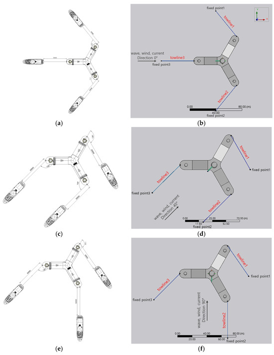 In the analysis coordinate system, the environmental load directions were defined as 0° along the +X-axis, 90° along the +Y-axis, 180° along the –X-axis, and 270° along the –Y-axis, and all environmental loads were applied according to this convention. Figure 7 presents, for the five directions (0°, 45°, 90°, 135°, and 180°), the tugboat arrangement diagrams on the left and the corresponding analysis model overviews on the right.